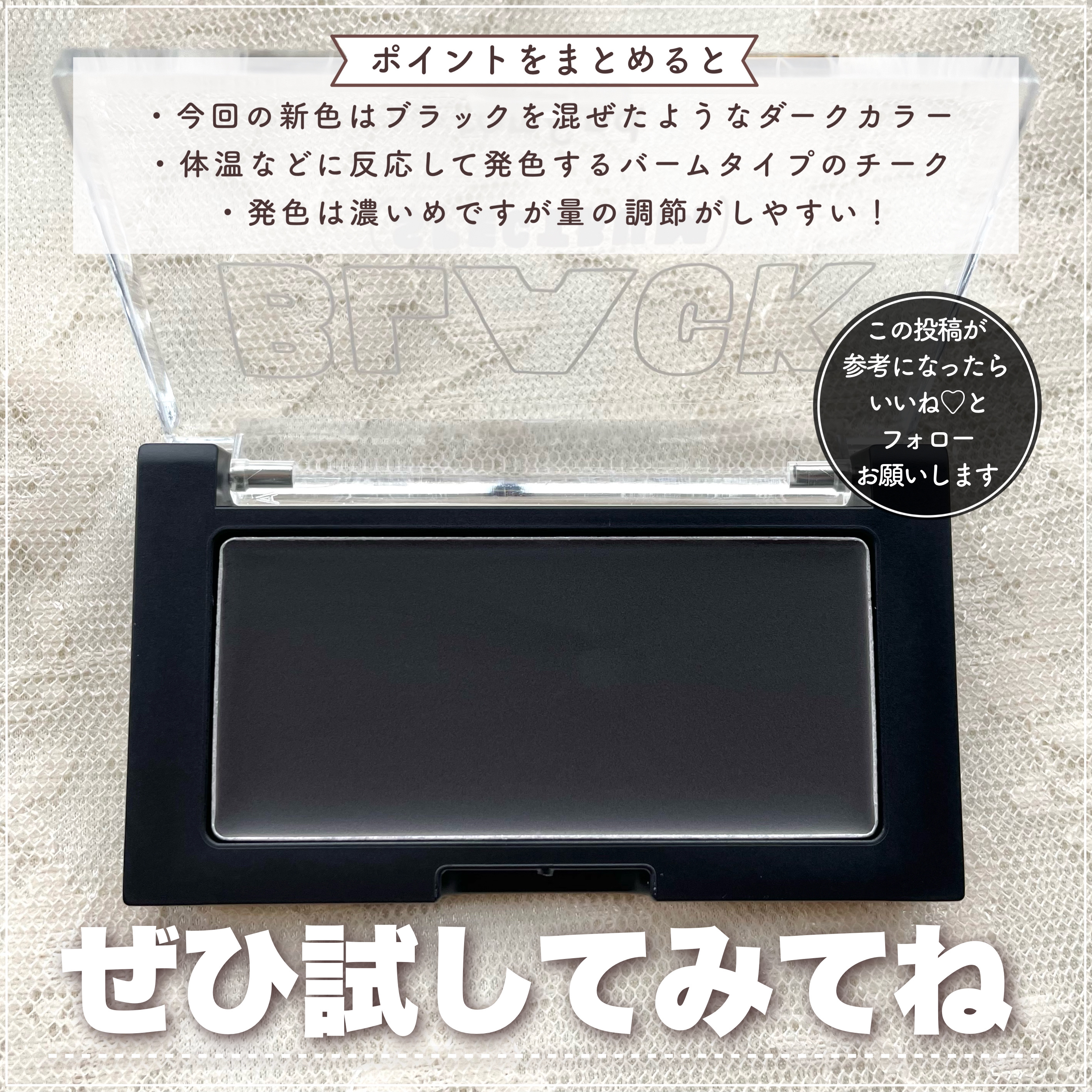 B01 ジンジャーナイト:肌馴染みの良いくすみベージュ B02 ベリーダウン:儚げなクールベースのソフトなピンク B03 ブラックバーム:肌の温度、pH濃度、身体の水分濃度によって変化するなめらかなバームタイプ(私はベリー系になりました)