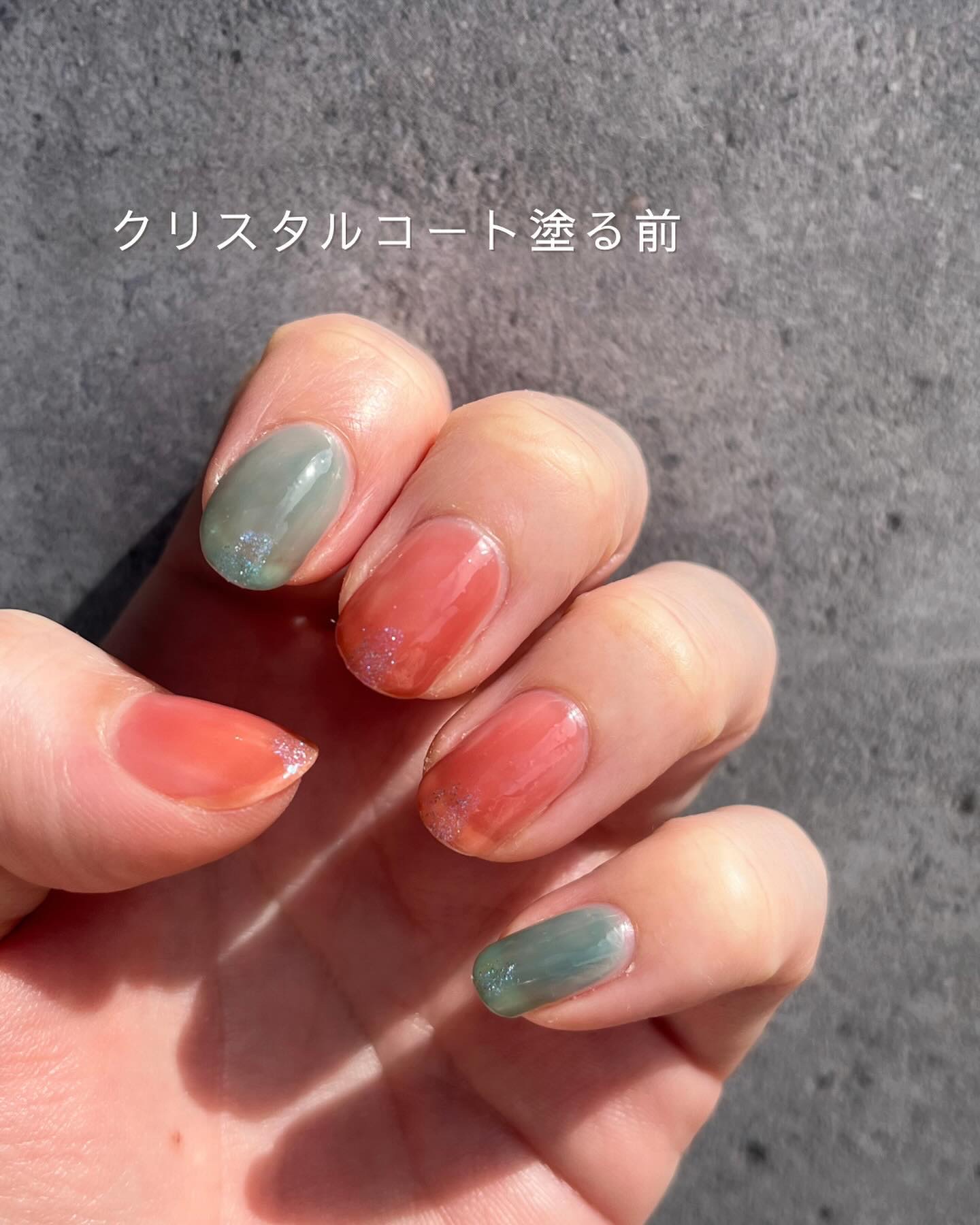 マニキュアでグラデネイルって難しくないですか?グラデするにはスポンジ使う裏技もあるけどそーいうのちょっとめんどくさいっ🤣笑そんな方におすすめなのが透け感たっぷりカラーを使うこと♡1度塗り目がほぼ透明ってくらい薄い色だと境目が分かりづらいのでい...