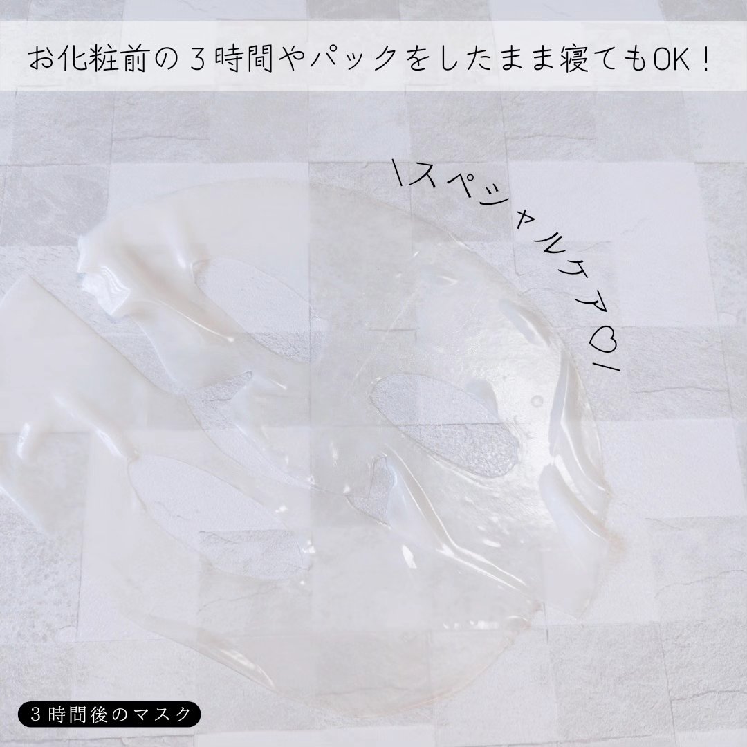ハイドロゲルタイプのマスク!! 最低3時間使用のスリーピングパック✨ 時間の経過とともに、美容液がお肌に吸収され 乳白色だったシートが透明に変わります。 お肌に貼り付けた時のひんやり感が気持ち良いです♫ 朝起きて剥がす時が私は楽しいです♫
