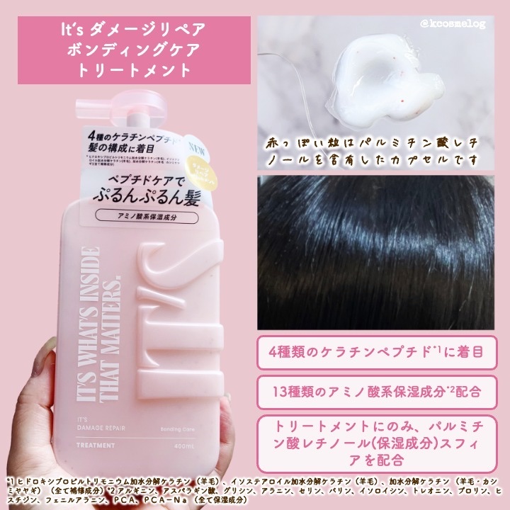 商品詳細情報IT’S WHAT’S INSIDE THAT MATTERS. ダメージリペア ボンディングケア シャンプー/トリートメント