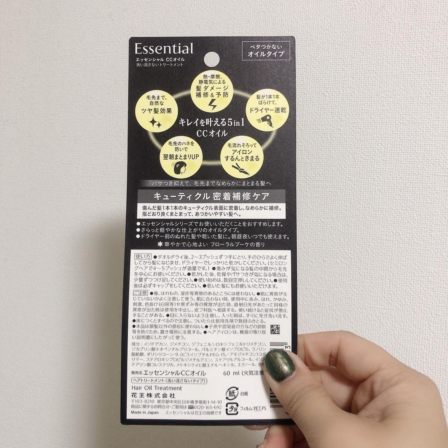【商品】エッセンシャルCCオイル¥836★商品の特徴★・髪ダメージ補修&予防・ツヤ髪効果・ドライヤー速乾・翌朝まとまりUP・アイロンするんときまる★髪全体&前髪比較★画像で詳しくご紹介しています❕ぜひご覧ください!🩶メリット🩶♡うねりを抑えて...