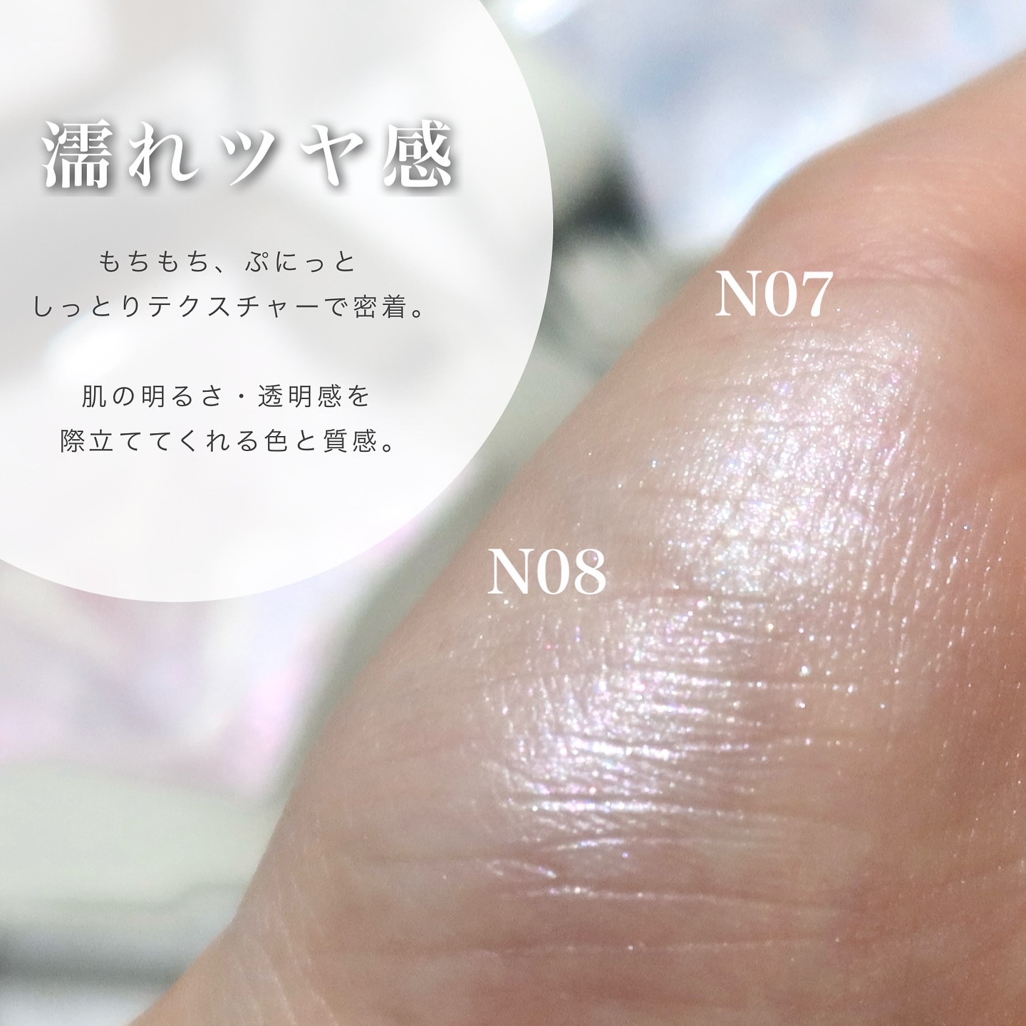 - 「ダイヤモンドのような輝き」天の川のように輝く、透明感と輝きに優れた真珠のような光沢。 複数のファインダイヤモンドの輝きを再現 <01 シルバーホワイト> シルバーホワイトのカラーが美しく輝いてツヤと透明感をプラス。なめらかでモチっとしたテクスチャーと小粒のラメが美しいツヤ肌を演出。Tゾーンや頬骨、デコルテなど光を与えたい部分に塗ればダイアモンドのように輝く。 <02 ライトシャンパン> ライトシャンパンのカラーが血色感と自然な光沢感をプラス。なめらかでモチっとしたテクスチャーと小粒のラメが美しいツヤ肌を演出。Tゾーンや頬骨、デコルテなど光を与えたい部分に塗ればダイアモンドのように輝く。 <03 シャンパンゴールド> シャンパンゴールドのカラーが表情を華やかに引き立てる。なめらかでモチっとしたテクスチャーと小粒のラメが美しいツヤ肌を演出。Tゾーンや頬骨、デコルテなど光を与えたい部分に塗ればダイアモンドのように輝く。 <05 シャンパンピンク> シャンパンピンクのカラーが血色感と透明感を与える。チークに重ねればピンクが引き立つ!なめらかでモチっとしたテクスチャーと小粒のラメが美しいツヤ肌を演出。Tゾーンや頬骨、デコルテなど光を与えたい部分に塗ればダイアモンドのように輝く。 <N01 シルバーホワイト> シルバーカラーのきらめきで、一瞬で透明感ある印象に。 小粒パール+大粒グリッターの組み合わせが、星屑のように繊細かつ大胆に煌めいてワンランク上のメイクに仕上げる。なめらか&モチっとした使用感で肌に高密着。 光を反射させる高屈折オイル配合でどの角度でもツヤ肌を実現。 鼻・頬・目頭・眉下以外にも、肩やデコルテに仕込めばお顔のツヤとリンクして、内から輝くような自然な印象に。 <N02 ライトシャンパン> ライトシャンパンのカラーが肌の色に自然になじみながら、ほどよいツヤと立体感をプラス。 小粒パール+大粒グリッターの組み合わせが、星屑のように繊細かつ大胆に煌めいてワンランク上のメイクに仕上げる。 なめらか&モチっとした使用感で肌に高密着。光を反射させる高屈折オイル配合でどの角度でもツヤ肌を実現。 鼻・頬・目頭・眉下以外にも、肩やデコルテに仕込めばお顔のツヤとリンクして、内から輝くような自然な印象に。 <N07 ネビュラブルー 日本限定色> ブルーとパープルの大粒ラメと、細かいシルバーラメが混ぜ合わさって色白な肌にツヤ感を与えてより明るく見せることができる! <N08 ネビュラパープル 日本限定色> パープルとピンク色の大粒ラメと、細かいシルバーラメが混ぜ合わさって、どのような肌色にもぴったり!かわいらしい雰囲気が作れる。
