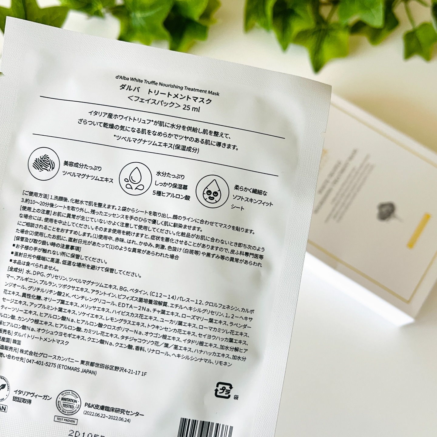 イタリア産ホワイトトリュフが肌に水分を供給し肌を整えて、ざらついて乾燥の気になる肌をなめらかでツヤのある肌に導く。 ホワイト×ゴールドの高級感のあるパッケージが素敵!個装になっているので、衛生的で、持ち運びにも便利です。 使用後の肌は、本当にいい感じ♪プチプラマスクに比べたら高級品ですが、成分や使用感、仕上がりをトータル的に見たら、むしろコスパいい!