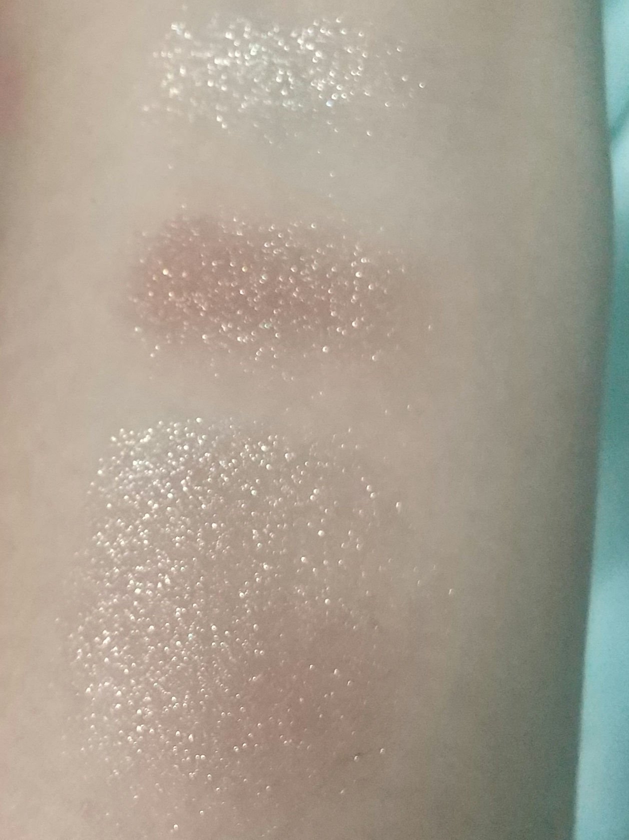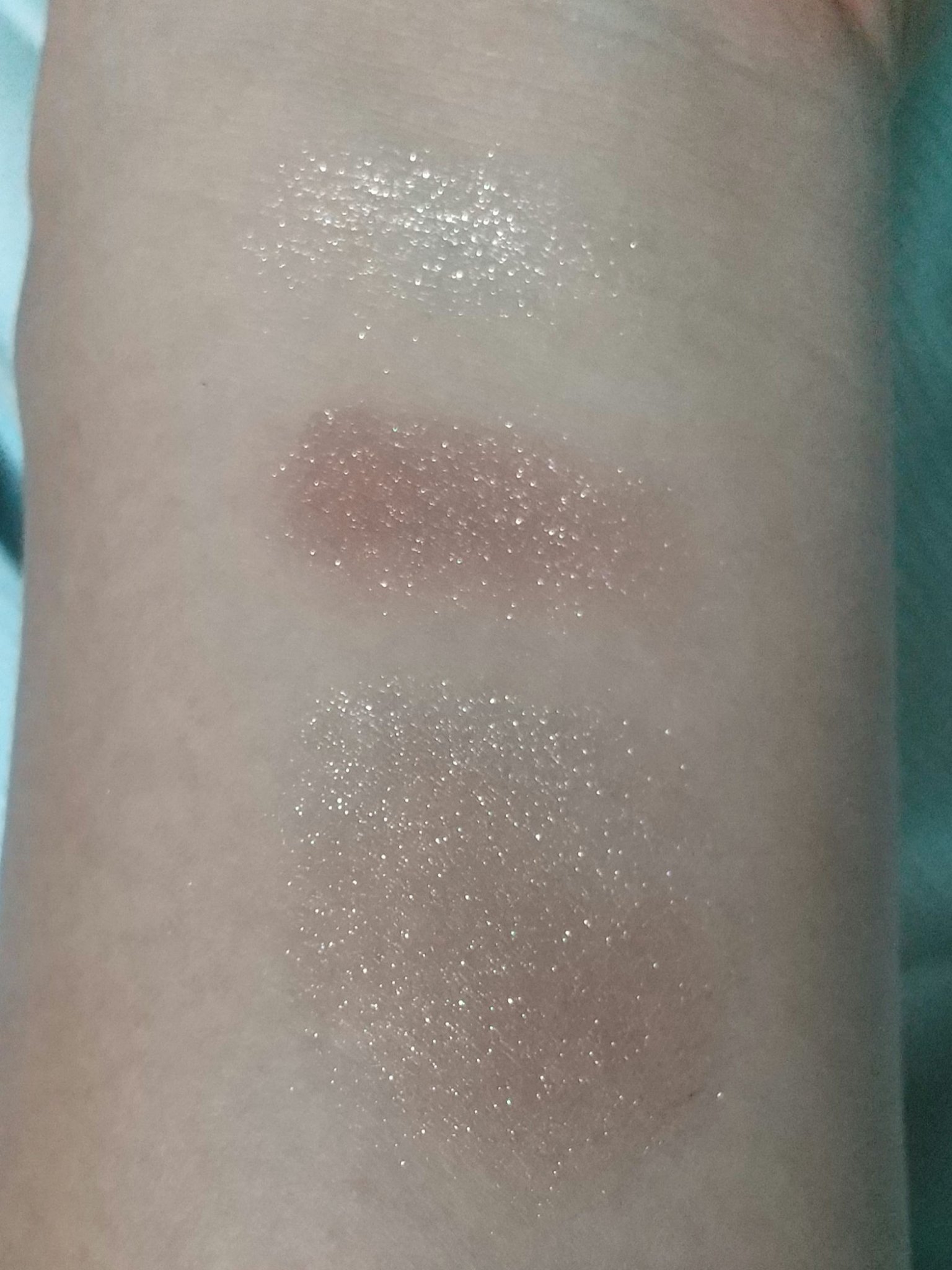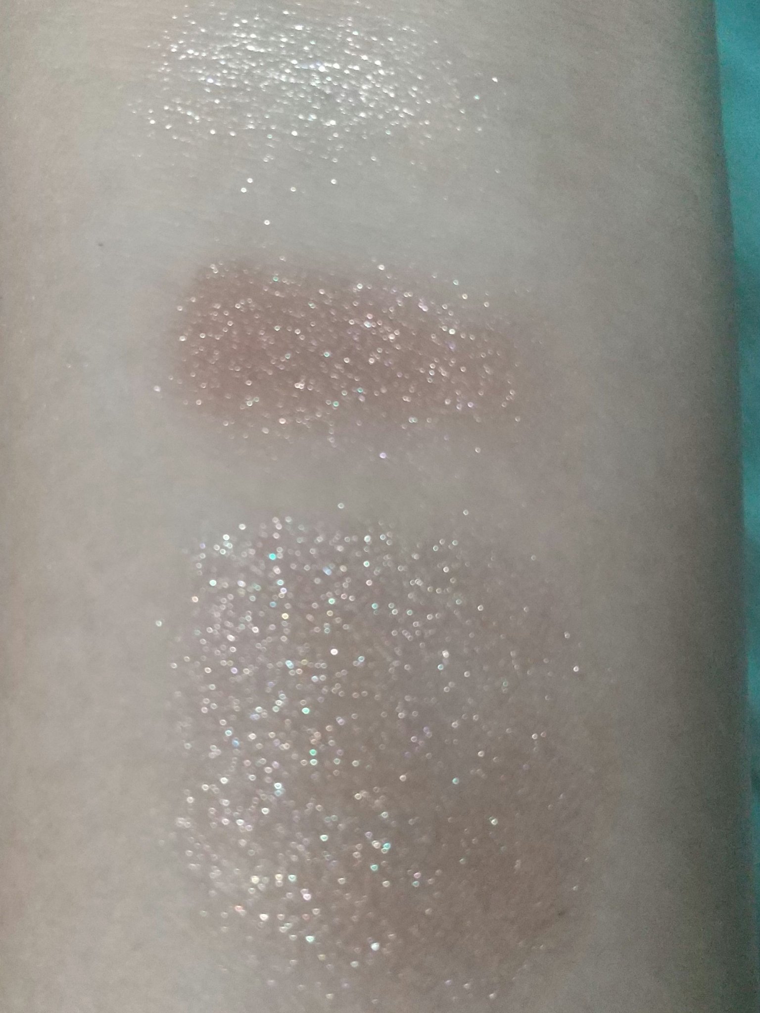 左上、左下、真ん中上、真ん中下、右上、右下という順番でスウォッチしてみました。 出してみると商品の写真より肌にのせたほうがくすみが出るかな✨という印象です😌 伸ばしやすくて指でも筆でもつけやすいです☺️💕 とっても可愛いカラーなのでオススメです💠