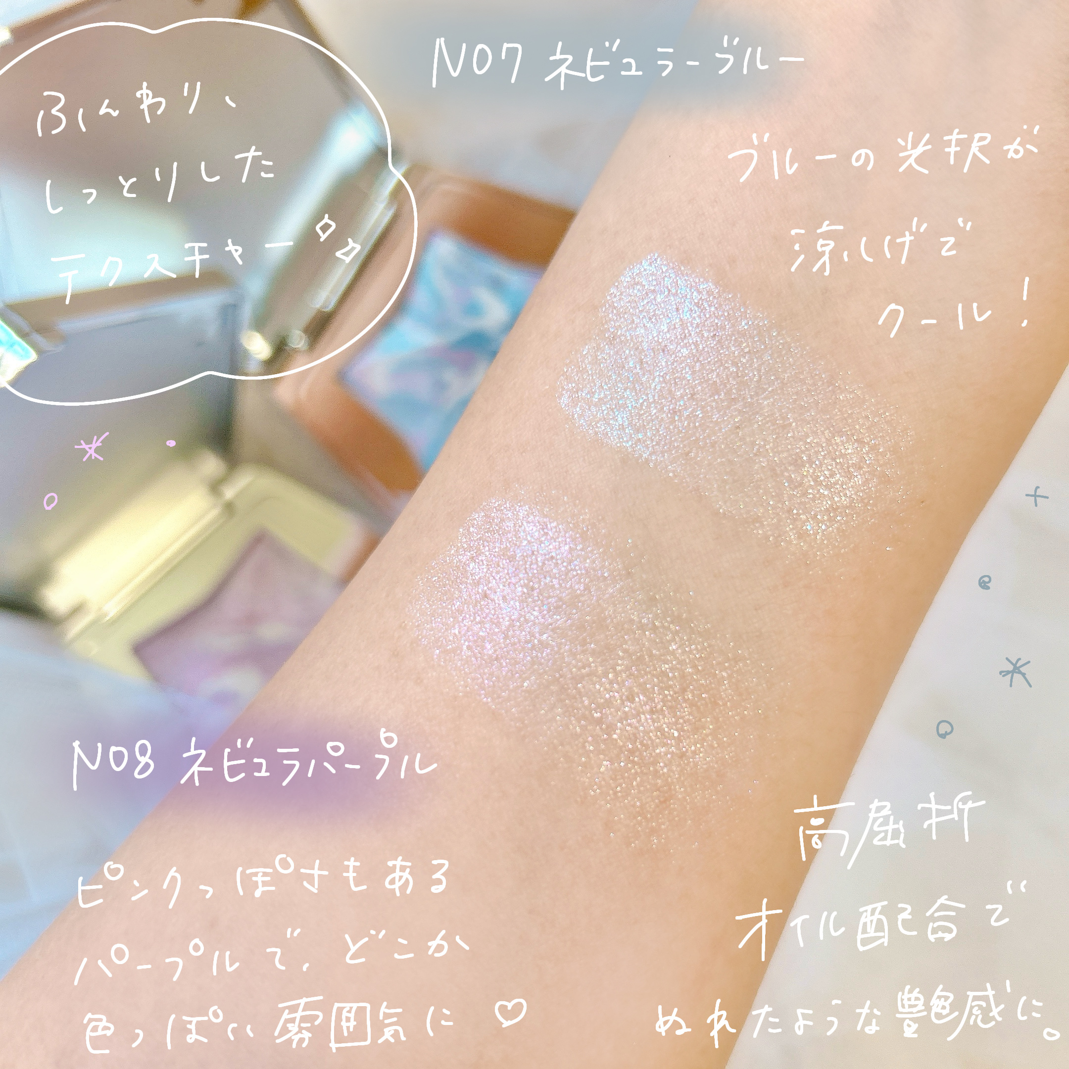 - 「ダイヤモンドのような輝き」天の川のように輝く、透明感と輝きに優れた真珠のような光沢。 複数のファインダイヤモンドの輝きを再現 <01 シルバーホワイト> シルバーホワイトのカラーが美しく輝いてツヤと透明感をプラス。なめらかでモチっとしたテクスチャーと小粒のラメが美しいツヤ肌を演出。Tゾーンや頬骨、デコルテなど光を与えたい部分に塗ればダイアモンドのように輝く。 <02 ライトシャンパン> ライトシャンパンのカラーが血色感と自然な光沢感をプラス。なめらかでモチっとしたテクスチャーと小粒のラメが美しいツヤ肌を演出。Tゾーンや頬骨、デコルテなど光を与えたい部分に塗ればダイアモンドのように輝く。 <03 シャンパンゴールド> シャンパンゴールドのカラーが表情を華やかに引き立てる。なめらかでモチっとしたテクスチャーと小粒のラメが美しいツヤ肌を演出。Tゾーンや頬骨、デコルテなど光を与えたい部分に塗ればダイアモンドのように輝く。 <05 シャンパンピンク> シャンパンピンクのカラーが血色感と透明感を与える。チークに重ねればピンクが引き立つ!なめらかでモチっとしたテクスチャーと小粒のラメが美しいツヤ肌を演出。Tゾーンや頬骨、デコルテなど光を与えたい部分に塗ればダイアモンドのように輝く。 <N01 シルバーホワイト> シルバーカラーのきらめきで、一瞬で透明感ある印象に。 小粒パール+大粒グリッターの組み合わせが、星屑のように繊細かつ大胆に煌めいてワンランク上のメイクに仕上げる。なめらか&モチっとした使用感で肌に高密着。 光を反射させる高屈折オイル配合でどの角度でもツヤ肌を実現。 鼻・頬・目頭・眉下以外にも、肩やデコルテに仕込めばお顔のツヤとリンクして、内から輝くような自然な印象に。 <N02 ライトシャンパン> ライトシャンパンのカラーが肌の色に自然になじみながら、ほどよいツヤと立体感をプラス。 小粒パール+大粒グリッターの組み合わせが、星屑のように繊細かつ大胆に煌めいてワンランク上のメイクに仕上げる。 なめらか&モチっとした使用感で肌に高密着。光を反射させる高屈折オイル配合でどの角度でもツヤ肌を実現。 鼻・頬・目頭・眉下以外にも、肩やデコルテに仕込めばお顔のツヤとリンクして、内から輝くような自然な印象に。 <N07 ネビュラブルー 日本限定色> ブルーとパープルの大粒ラメと、細かいシルバーラメが混ぜ合わさって色白な肌にツヤ感を与えてより明るく見せることができる! <N08 ネビュラパープル 日本限定色> パープルとピンク色の大粒ラメと、細かいシルバーラメが混ぜ合わさって、どのような肌色にもぴったり!かわいらしい雰囲気が作れる。