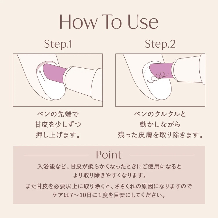 今回のキューティクルペンは、スティック形でそのまま甘皮が一本で処理できる🌟 (普段のケアより、使い心地が優しかったです) アロマの香り 今回のは『スウィートリリー』でした。 たまたま同一メーカーのネイルオイルを使ってましたが、 ネイルオイルより香りは穏やかで使いやすい。 使用頻度は【7~10日に1回】 お風呂上がりの甘皮か柔らかい時を推奨。