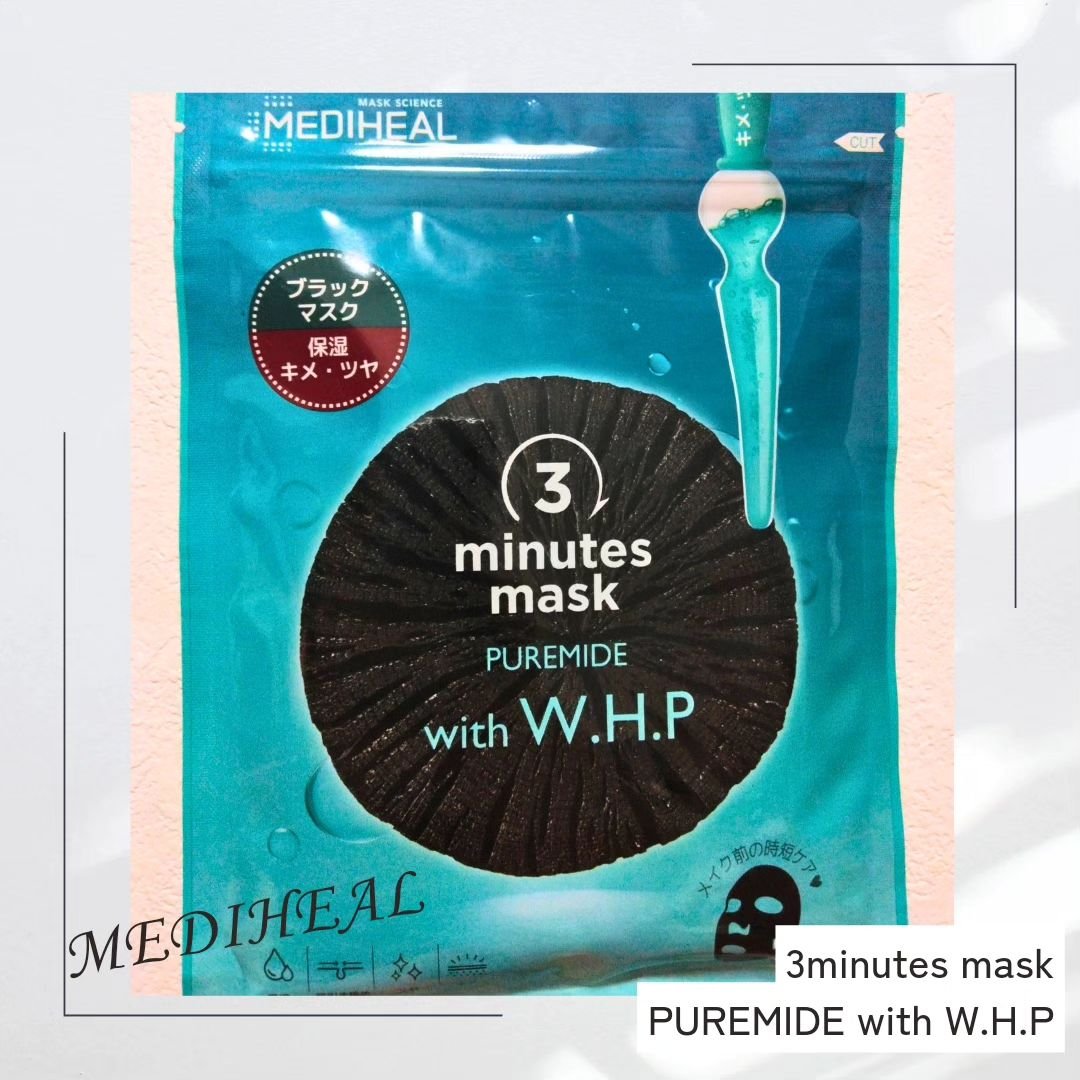 MEDIHEAL3ミニッツマスク:ピュアマイドwithW.H.P黒が印象的なフェイスパック。3分というのが嬉しいですね!化粧水で整えた後に、最高5分までつけてOKみたいです。残った美容液は首につけたり、七枚入りで飽きない。#提供...