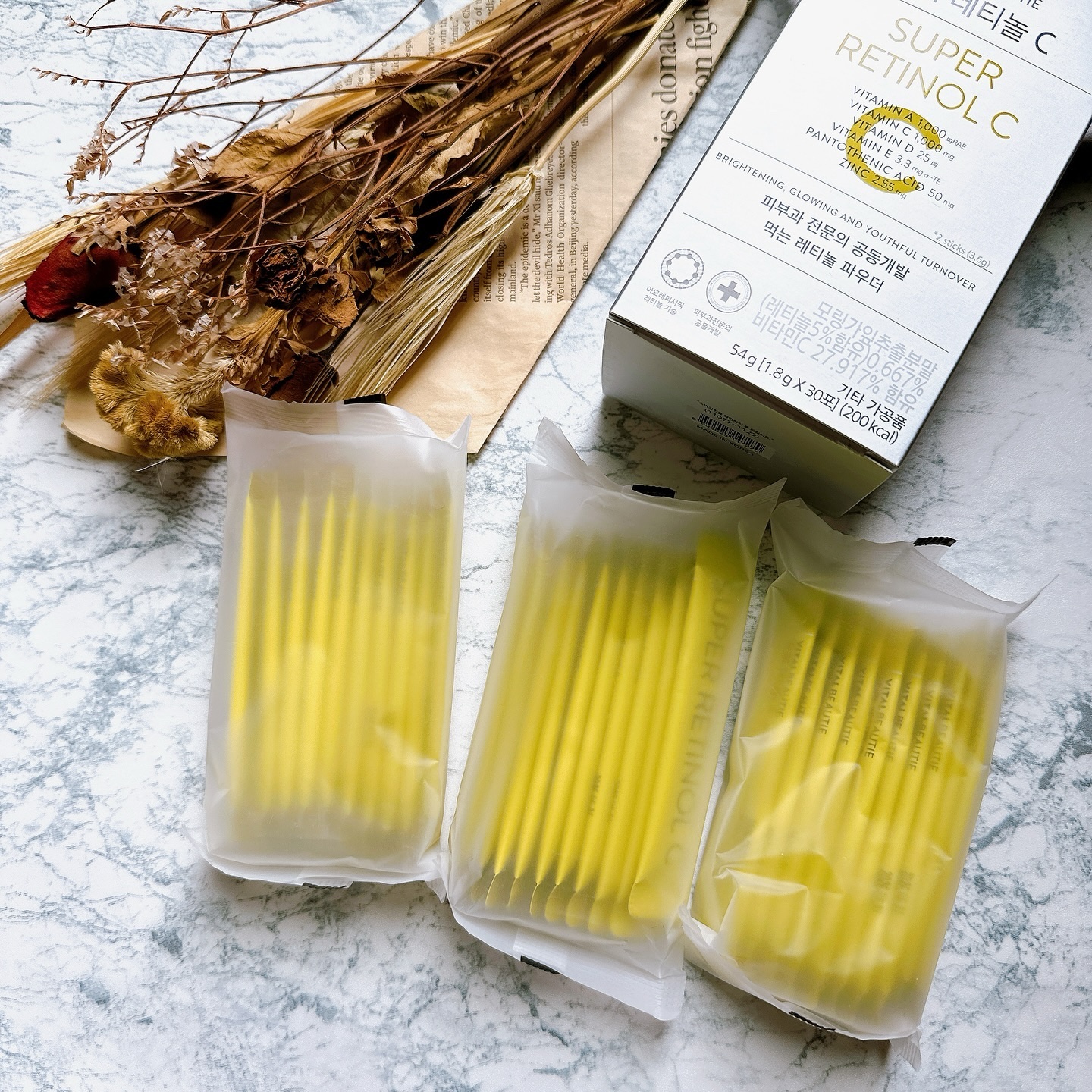 - 食べるタイプのレチノール 1) 専門家のフォーミュラ Flex! - 皮膚科専門医とアモーレパシフィックが共同開発 29年間蓄積したレチノール技術で完成! 食べるレチノールプロテクション技術を適用 (ビタミンA、1000ugRAE配合*) 2) 明るく輝く! - 豊富に含むビタミンC1,000mg含有* - パントテン酸1日栄養成分基準配合* - ビタミンE、ビタミンD、亜鉛 副成分 L-システインとヘスペリジンを配合 3) さわやかなシトラスの味 「ヴィーガンレチノール」 - ヴィーガン認証を取得した毎日摂取できる美味しいレチノール *上記の栄養成分の数値は、2包摂を基準に作成された含量です *お召し上がり方! 1回1~2包を 直接摂取してください