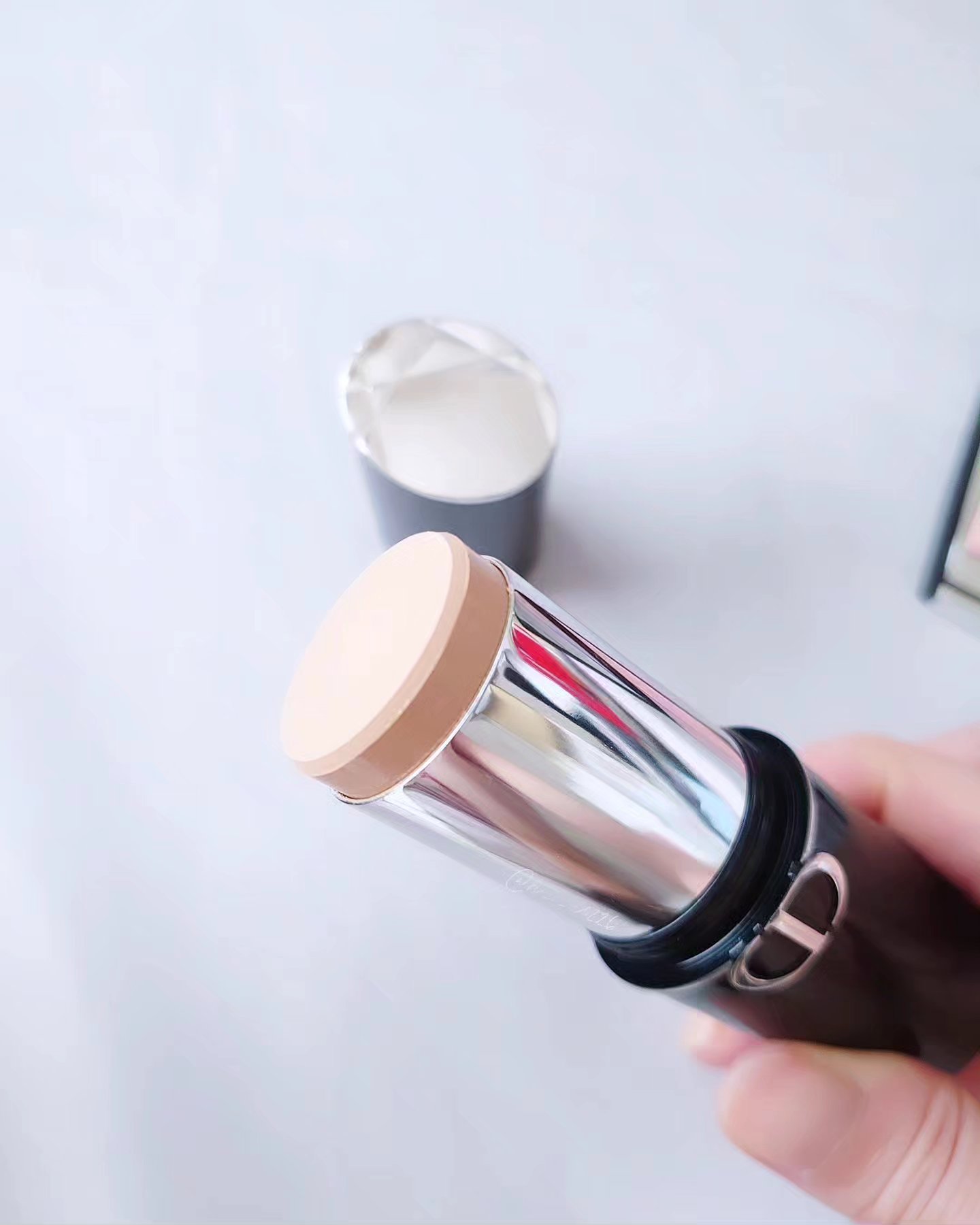 まず伸びが凄く良いので出し過ぎ注意です💡 肌が重たくない事にビックリ😲❣️ 塗りたては艶々して見えるけどセミマットって感じかな🤔? 付け心地が軽くて肌が綺麗に見えるし、赤味も毛穴もカバーしてくれるのは良い😍💗 テクスチャーは硬めかと思いきや滑らか☝ チークに使うときは指で取ってポンポンと叩き、馴染ませました😍🤍 リップはブラシを使って塗ったのですが、艶が綺麗だしティッシュオフしてもほんのり色が残っている🌼 ヘルシーピンクは可愛い系の色かな😘 ライヴリーローズウッドの方はクールな感じに仕上がると思った😋💚 パケもガラス容器で高級感がある😌❤️