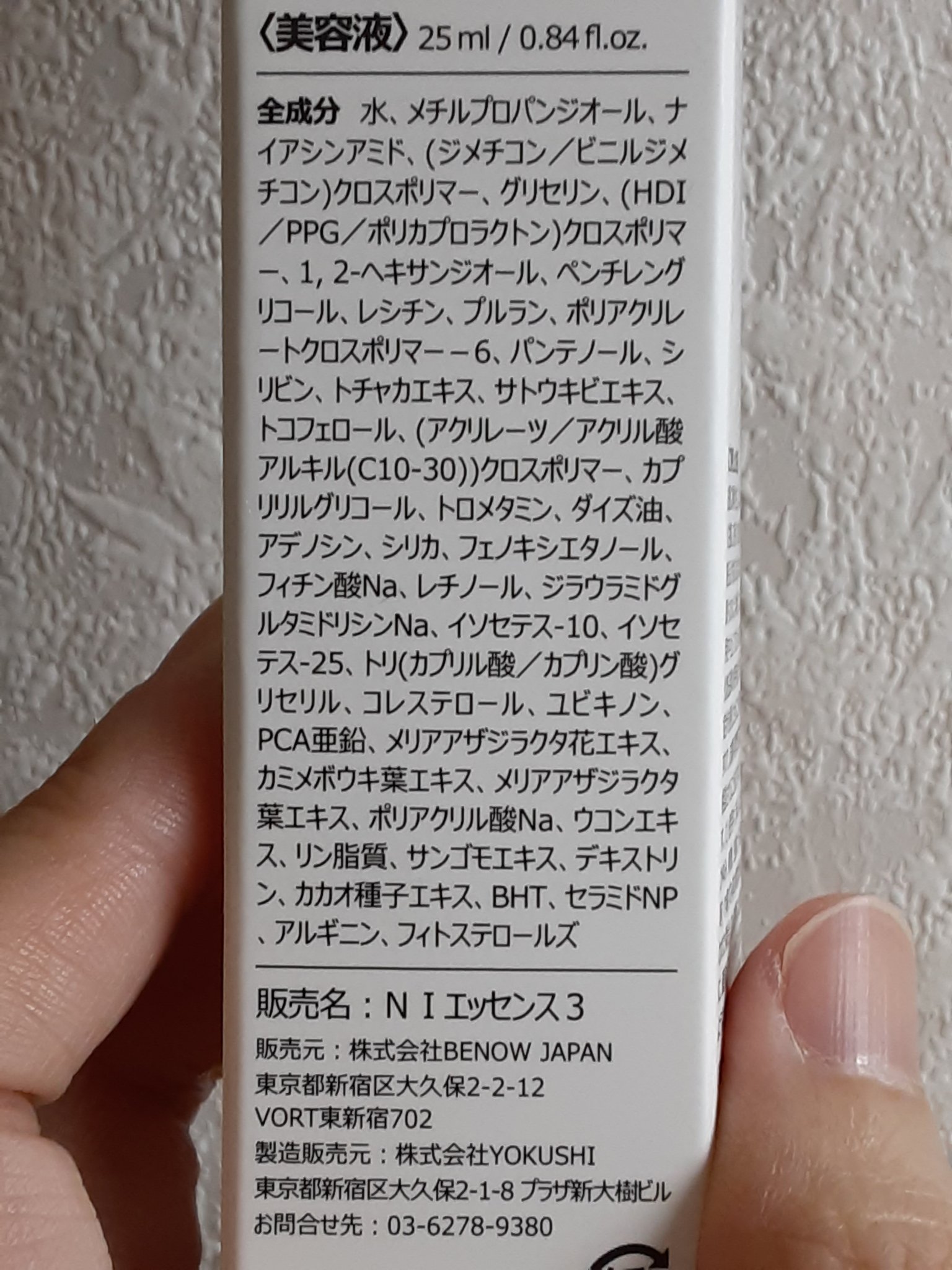 - <25ml> 水、メチルプロパンジオール、ナイアシンアミド、(ジメチコン/ビニルジメチコン)クロスポリマー、グリセリン、(HDI/PPG/ポリカプロラクトン)クロスポリマ一、1, 2-ヘキサンジオール、ペンチレングリコール、レシチン、プルラン、ポリアクリレートクロスポリマーー6、パンテノール、シリビン、トチャカエキス、サトウキビエキス、トコフェロール、(アクリレーツ/アクリル酸アルキル(C10-30))クロスポリマー、カプリリルグリコール、トロメタミン、ダイズ油、アデノシン、シリカ、フェノキシエタノール、フィチン酸Na、レチノール、ジラウラミドグルタミドリシンNa、イソセテス-10、イソセテス-25、トリ(カプリル酸/カプリン酸) グリセリル、コレステロール、ユビキノン、PCA亜鉛、メリアアザジラクタ花エキス、カミメボウキ葉エキス、メリアアザジラクタ 葉エキス、ポリアクリル酸Na、ウコンエキス、リン脂質、サンゴモエキス、デキストリン、カカオ種子エキス、BHT、セラミドNP、アルギニン、フィトステロールズ