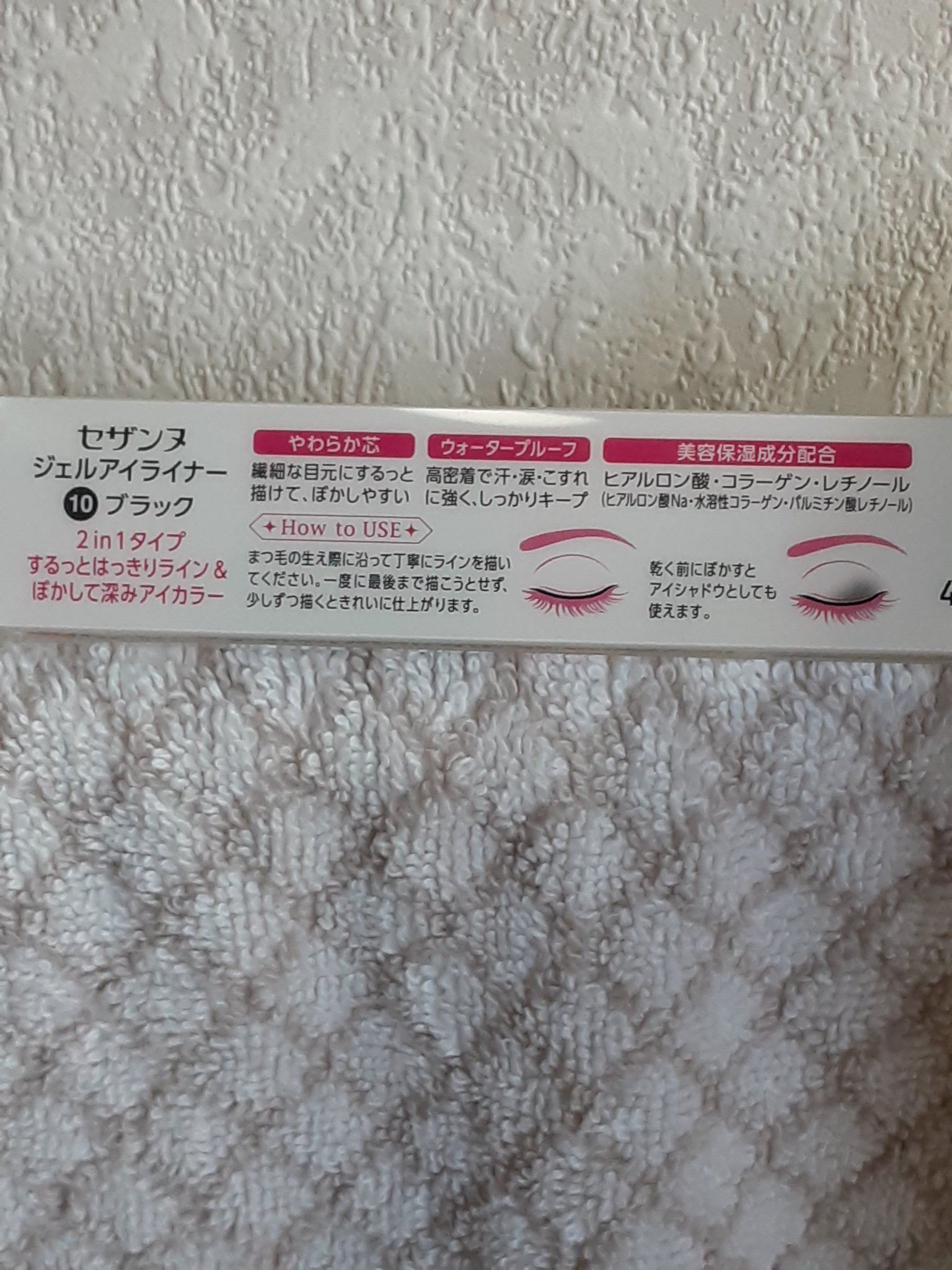 - なめらか高密着2in1ジェルアイライナー。 ぼかして使うとアイカラーとしても使える2in1タイプ。 オイルリッチ処方でなめらかな描き心地。 高密着で、水・汗・涙・こすれに強いウォータープルーフ。 保湿成分(ヒアルロン酸・コラーゲン・レチノール(ヒアルロン酸Na・水溶性コラーゲン・パルミチン酸レチノール))配合。