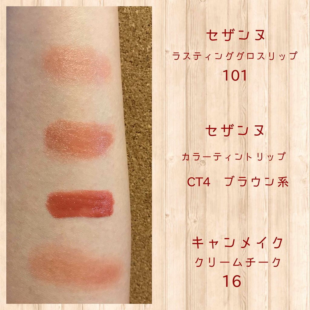 セザンヌカラーティントリップCT4ブラウン系600円税抜キャンメイクと同時に購入したリップでやっと投稿出来ました😆✨1週間仕事忙しかった🤣もう1つラスティンググロスリップ101と共に毎日持ち歩いて使ってみました。最初に色が‼️可愛い‼️‼️何...