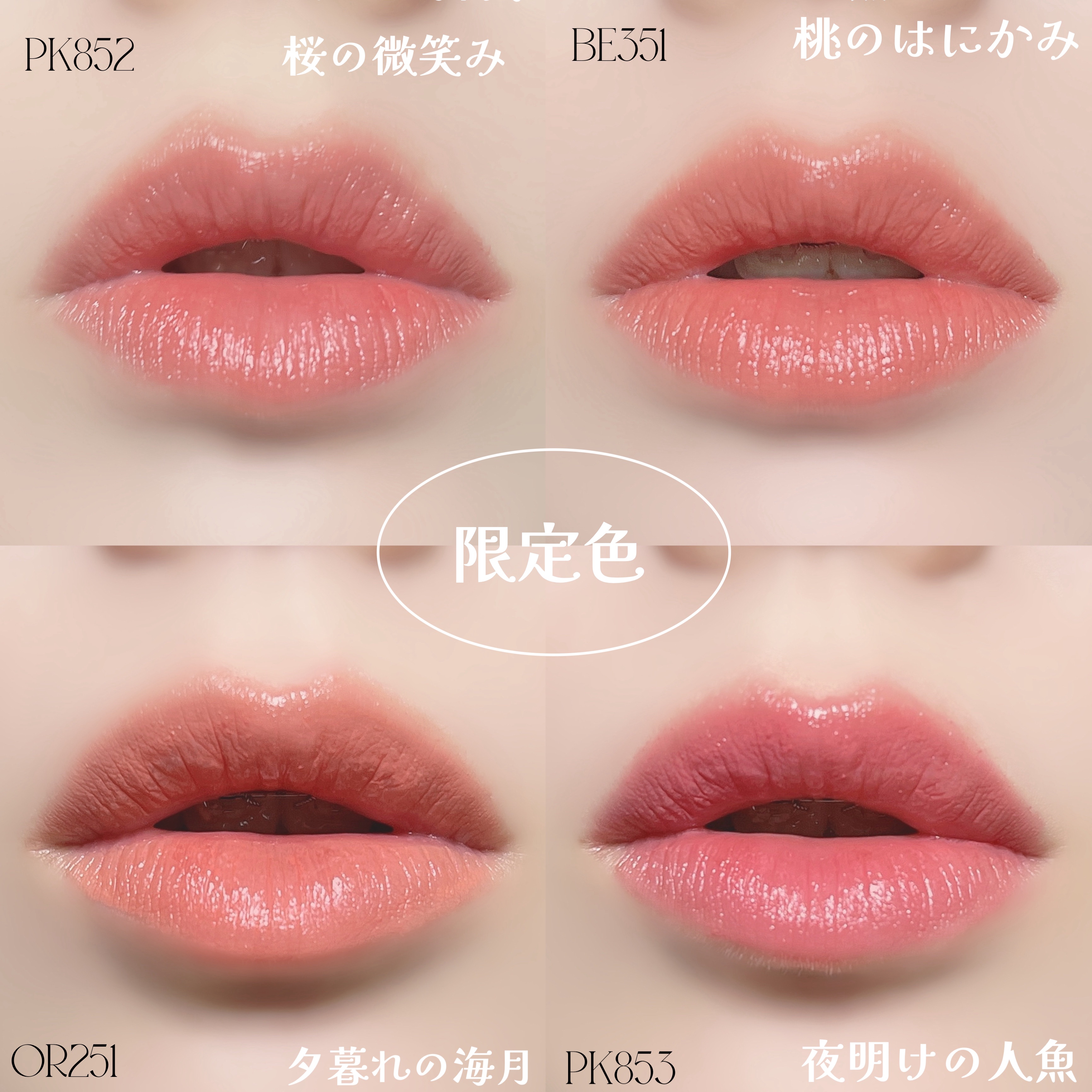 - <BE351 桃のはにかみ> ジフェニルジメチコン、デカエチルヘキサン酸ポリグリセリル-10、(VP/ヘキサデセン)コポリマー、イソドデカン、トリメチルシロキシフェニルジメチコン、テトラエチルヘキサン酸ペンタエリスリチル、トリイソステアリン酸ポリグリセリル-2、合成ワックス、ジメチコン、フェニルトリメチコン、イソステアリン酸デキストリン、DPG、トコフェロール、ヒアルロン酸Na、BHT、(エイコセン/ビニルピロリドン)コポリマー、(エチレン/プロピレン)コポリマー、カルナウバロウ、キャンデリラロウ、キャンデリラロウエステルズ、ジメチルシリル化シリカ、スクワラン、トリイソステアリン酸イソプロピルチタン、ハイドロゲンジメチコン、メチコン、水酸化Al、炭酸Ca、酸化チタン、酸化鉄、黄4、赤202 <BR350 林檎の口づけ> ジフェニルジメチコン、デカエチルヘキサン酸ポリグリセリル-10、(ビニルピロリドン/ヘキサデセン)コポリマー、イソドデカン、トリメチルシロキシフェニルジメチコン、テトラエチルヘキサン酸ペンタエリスリチル、トリイソステアリン酸ポリグリセリル-2、合成ワックス、ジメチコン、フェニルトリメチコン、イソステアリン酸デキストリン、DPG、トコフェロール、ヒアルロン酸Na、BHT、(エイコセン/ビニルピロリドン)コポリマー、(エチレン/プロピレン)コポリマー、アルミナ、カルナウバロウ、キャンデリラロウ、キャンデリラロウエステルズ、シリカ、ジメチルシリル化シリカ、スクワラン、ハイドロゲンジメチコン、炭酸Ca、酸化チタン、酸化鉄、黄4、赤202 <BR352 駆け引きワイン(限定)> ジフェニルジメチコン、デカエチルヘキサン酸ポリグリセリル-10、(VP/ヘキサデセン)コポリマー、イソドデカン、トリメチルシロキシフェニルジメチコン、テトラエチルヘキサン酸ペンタエリスリチル、合成ワックス、ジメチコン、フェニルトリメチコン、トリイソステアリン酸ポリグリセリル-2、イソステアリン酸デキストリン、DPG、トコフェロール、ヒアルロン酸Na、BHT、(エイコセン/ビニルピロリドン)コポリマー、(エチレン/プロピレン)コポリマー、アルミナ、カルナウバロウ、キャンデリラロウ、キャンデリラロウエステルズ、シリカ、ジメチルシリル化シリカ、スクワラン、ハイドロゲンジメチコン、炭酸Ca、酸化チタン、酸化鉄、黄4、赤202 <OR250 海星の恋心> ジフェニルジメチコン、デカエチルヘキサン酸ポリグリセリル-10、(ビニルピロリドン/ヘキサデセン)コポリマー、イソドデカン、トリメチルシロキシフェニルジメチコン、トリイソステアリン酸ポリグリセリル-2、テトラエチルヘキサン酸ペンタエリスリチル、合成ワックス、ジメチコン、フェニルトリメチコン、イソステアリン酸デキストリン、DPG、トコフェロール、ヒアルロン酸Na、BHT、(エイコセン/ビニルピロリドン)コポリマー、(エチレン/プロピレン)コポリマー、アルミナ、カルナウバロウ、キャンデリラロウ、キャンデリラロウエステルズ、シリカ、ジメチルシリル化シリカ、スクワラン、ハイドロゲンジメチコン、炭酸Ca、酸化チタン、酸化鉄、黄4、赤202 <PK850 うさぎの恋人> ジフェニルジメチコン、デカエチルヘキサン酸ポリグリセリル-10、(ビニルピロリドン/ヘキサデセン)コポリマー、イソドデカン、トリメチルシロキシフェニルジメチコン、テトラエチルヘキサン酸ペンタエリスリチル、トリイソステアリン酸ポリグリセリル-2、合成ワックス、ジメチコン、フェニルトリメチコン、イソステアリン酸デキストリン、DPG、トコフェロール、ヒアルロン酸Na、BHT、(エイコセン/ビニルピロリドン)コポリマー、(エチレン/プロピレン)コポリマー、アルミナ、カルナウバロウ、キャンデリラロウ、キャンデリラロウエステルズ、シリカ、ジメチルシリル化シリカ、スクワラン、ハイドロゲンジメチコン、炭酸Ca、酸化チタン、酸化鉄、黄4、赤202 <PK851 わがままな肉球> ジフェニルジメチコン、デカエチルヘキサン酸ポリグリセリル-10、(ビニルピロリドン/ヘキサデセン)コポリマー、イソドデカン、トリメチルシロキシフェニルジメチコン、テトラエチルヘキサン酸ペンタエリスリチル、トリイソステアリン酸ポリグリセリル-2、合成ワックス、ジメチコン、フェニルトリメチコン、イソステアリン酸デキストリン、DPG、トコフェロール、ヒアルロン酸Na、BHT、(エイコセン/ビニルピロリドン)コポリマー、(エチレン/プロピレン)コポリマー、アルミナ、カルナウバロウ、キャンデリラロウ、キャンデリラロウエステルズ、シリカ、ジメチルシリル化シリカ、スクワラン、ハイドロゲンジメチコン、炭酸Ca、酸化チタン、酸化鉄、黄4、赤202 <PK852 桜の微笑み> ジフェニルジメチコン、デカエチルヘキサン酸ポリグリセリル-10、(VP/ヘキサデセン)コポリマー、イソドデカン、トリメチルシロキシフェニルジメチコン、テトラエチルヘキサン酸ペンタエリスリチル、合成ワックス、トリイソステアリン酸ポリグリセリル-2、ジメチコン、フェニルトリメ
