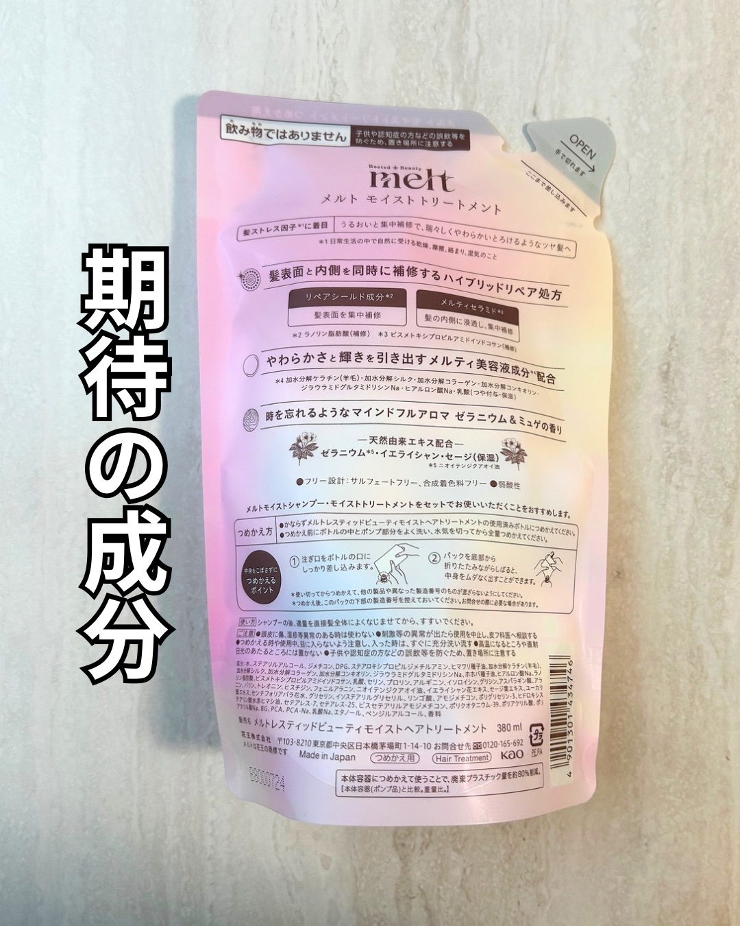 - ■髪ダメージの原因である髪ストレス因子※1に着目。 髪表面と内側を同時に集中補修するハイブリッドリペア処方で、瑞々しくやわらかいとろけるようなツヤ髪へ。 表面:シールドリペア成分※2で失われた表面脂質を補修して、なめらかで、毛流れが揃いやすい髪に。 内側:メルティセラミド※3で失われた内部脂質を補修して、柔軟性のある切れにくい髪に。 ※1 日常生活の中で自然に受ける乾燥、摩擦、絡まり、湿気のこと。 ※2 ラノリン脂肪酸(補修) ※3 ビスメトキシプロピルアミドイソドコサン(補修) ■メルティ美容液成分※4配合 髪内部にうるおいをため込む美容液成分配合。髪にやわらかさと輝きを与え、とろけるように揺れる美しい髪へ。 ※4 加水分解ケラチン(羊毛)・加水分解シルク・加水分解コラーゲン・加水分解コンキオリン・ジラウラミドグルタミドリシンNa・ヒアルロン酸Na・乳酸(つや付与・保湿) ■サルフェートフリー・合成着色料フリー・ノンシリコーン処方(シャンプーのみ)・弱酸性 ■時を忘れるようなマインドフルアロマの香り 高品質な天然精油をブレンド。透明感のある果実と花々の甘さに、ゼラニウムやセージなどの穏やかなハーバルアクセントを加えた、やわらかなムスクの香り。 【おすすめの使い方:クリーミーメルトフォームと混ぜて使うことができます。】 ヘッドスパ発想のとろシュワ生炭酸シャンプー 頭皮ケア(汚れ・皮脂洗浄)&毛髪ケア(補修)。トリートメントのなじみサポート効果も。 とろシュワ生炭酸シャンプーの作り方 STEP1 手のひらに500円玉程度の量の水を用意します。 STEP2 クリーミーメルトフォーム(炭酸パウダー 1スティック分(1g))を乗せます。 STEP3 メルトシャンプーを上に乗せ、軽く混ぜます。髪に塗布し、普段通り洗髪します。(セミロングで2プッシュ程度) 週に2~3回の使用をおすすめします。毎日ご使用いただいても問題ございません。