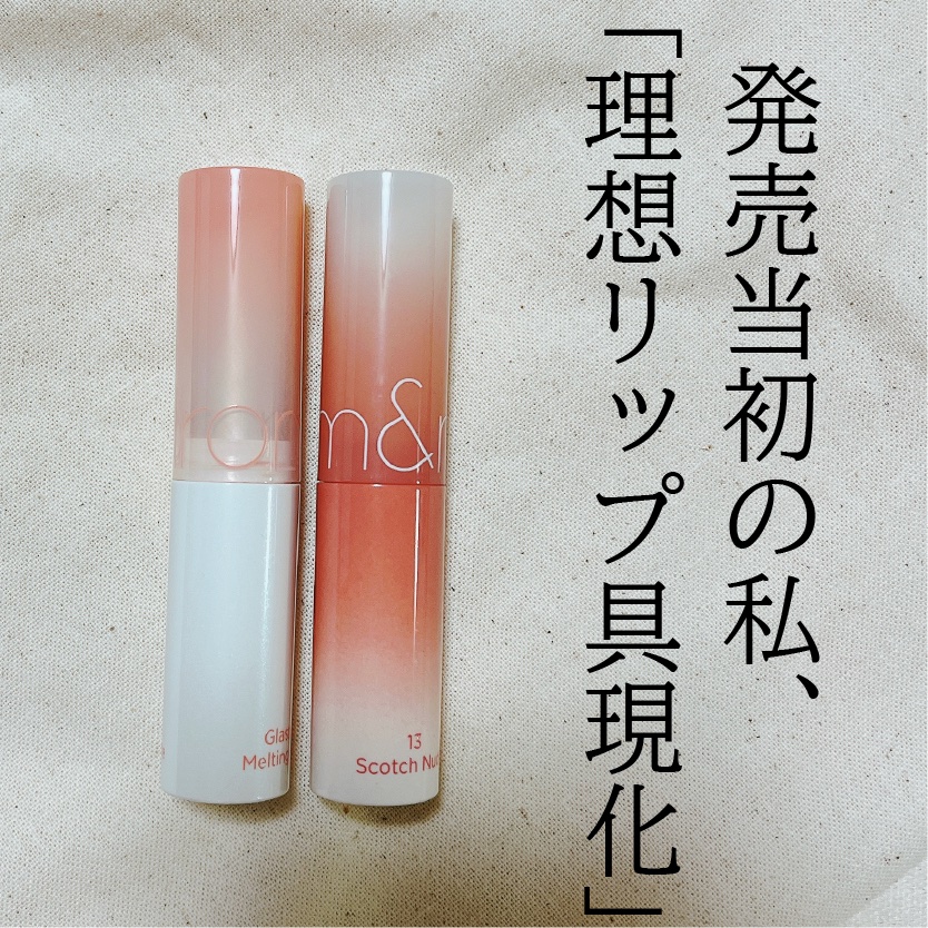 rom&ndのグラスティングメルティングバームがLIPSベスコスリップスティック部門第2位!! プルプルツヤツヤリップがかわいい!! これ、冬場の方がより使いやすいかも! 夏場だと結構柔らかくなりすぎちゃうこともあるから、塗ってる時に潰さないようにちょっとドキドキしちゃう時があったんだけど、冬なら安心してスルスル塗れる☺️ ティントじゃないから拭き取ればすぐに落ちるけど、 食事とかしなきゃ普通に過ごしてて落ちちゃうとか乾燥しちゃうとかがないので使いやすいです!!