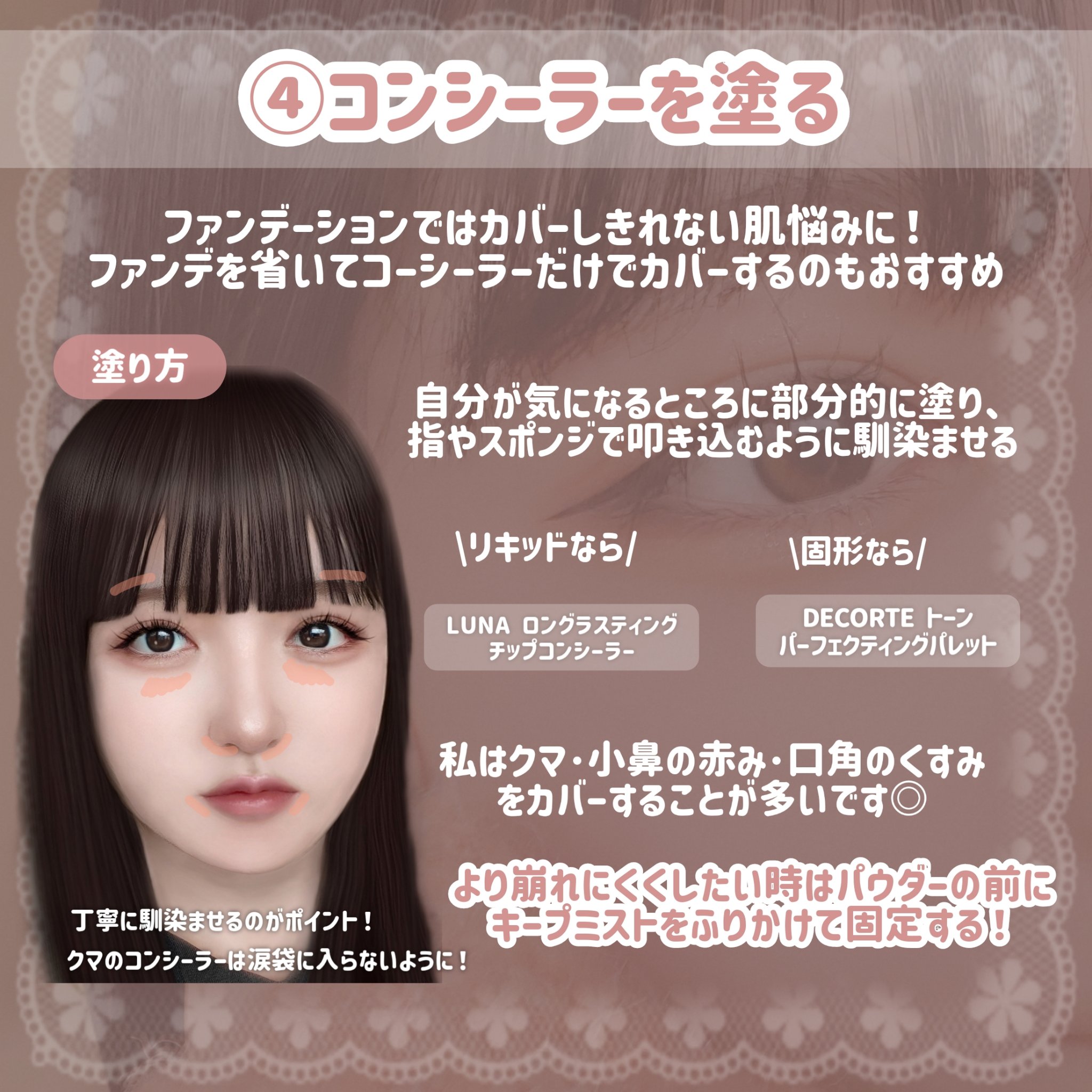 可愛くメイクしてもクマがあると顔色が悪く疲れて見えて台無しに、、、 クマは大きく分けて3タイプ/青クマ/茶クマ/黒クマ の3種類がある♪ それぞれ補色を駆使して目立たなくするのがクマ隠しの大事なポイント✍️ 睡眠不足や疲れなどによる血行不良が原因💦 紫外線や摩擦などによる色素沈着が原因💦 目の下の脂肪の膨らみやたるみが原因💦 実は1番隠すのが難しいのが黒クマ🧸 間違った方法でカバーすると逆に目立ってしまうので自分のタイプを知った上で正しくカバーするのが大切✨