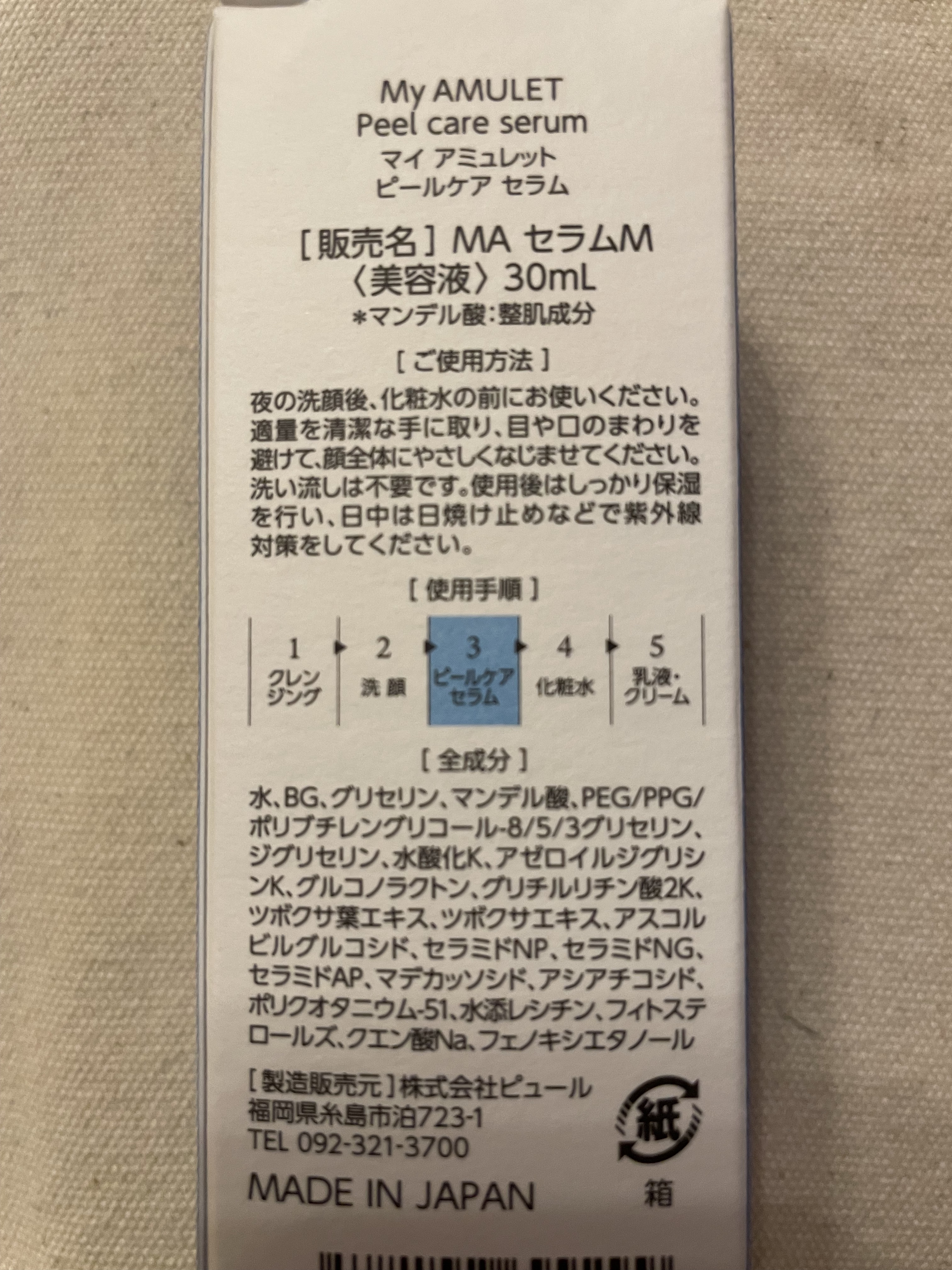 - <30mL> 水、BG、グリセリン、マンデル酸、PEG/PPG/ポリブチレングリコール-8/5/3グリセリン、ジグリセリン、水酸化K、アゼロイルジグリシンK、グルコノラクトン、グリチルリチン酸2K、ツボクサ葉エキス、ツボクサエキス、アスコルビルグルコシド、セラミドNP、セラミドNG、セラミドAP、マデカッソシド、アシアチコシド、ポリクオタニウム-51、水添レシチン、フィトステロールズ、クエン酸Na、フェノキシエタノール