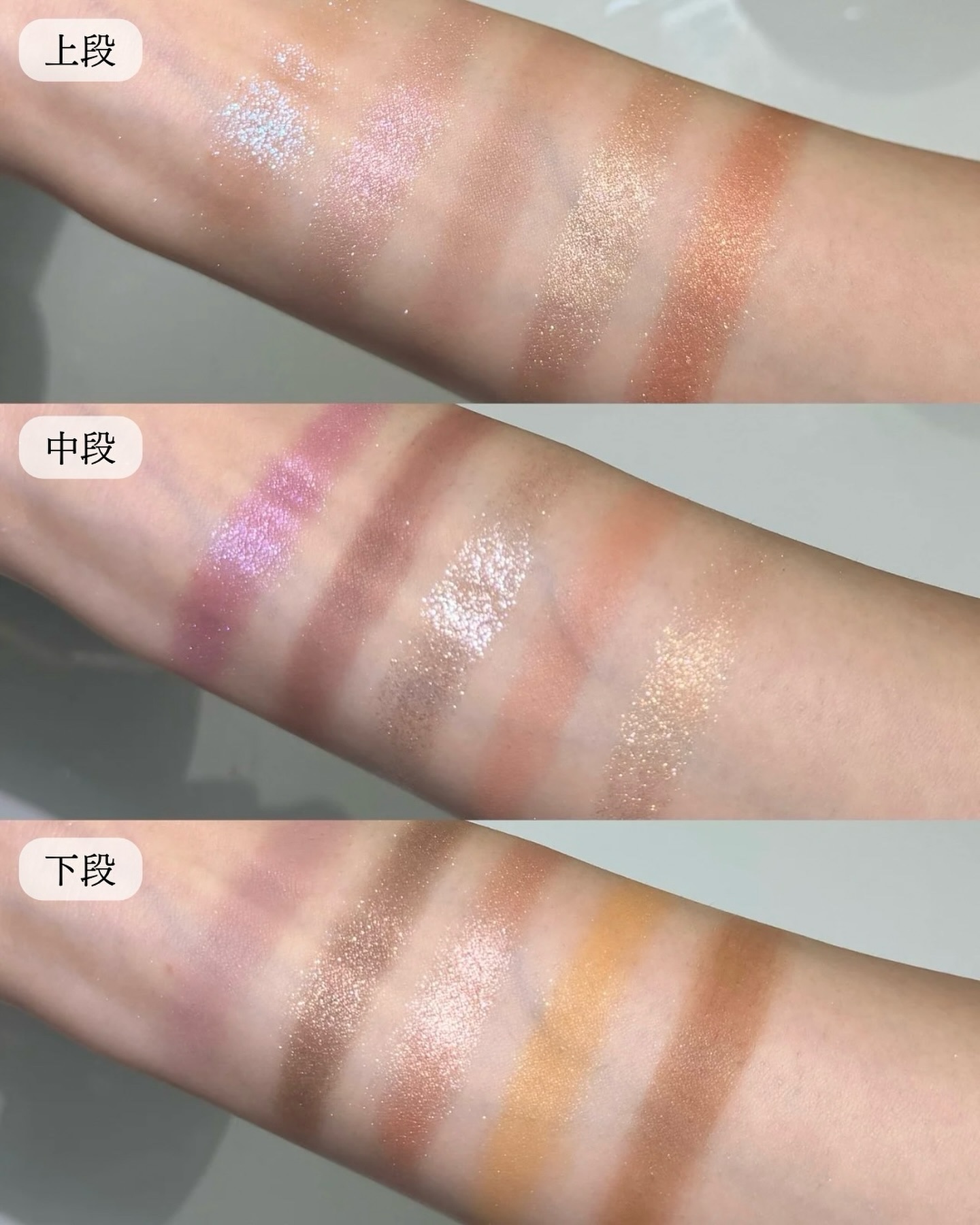 右上のピンクラメをベースに仕込んでメイクしたんだけどツヤと煌めき感えぐすぎる😳💎可愛い、、 そこに右下のカラーを重ねるとじんわり血色感が滲み出るような目元になるよ🦩 これは欠品店舗続出しそう🫣