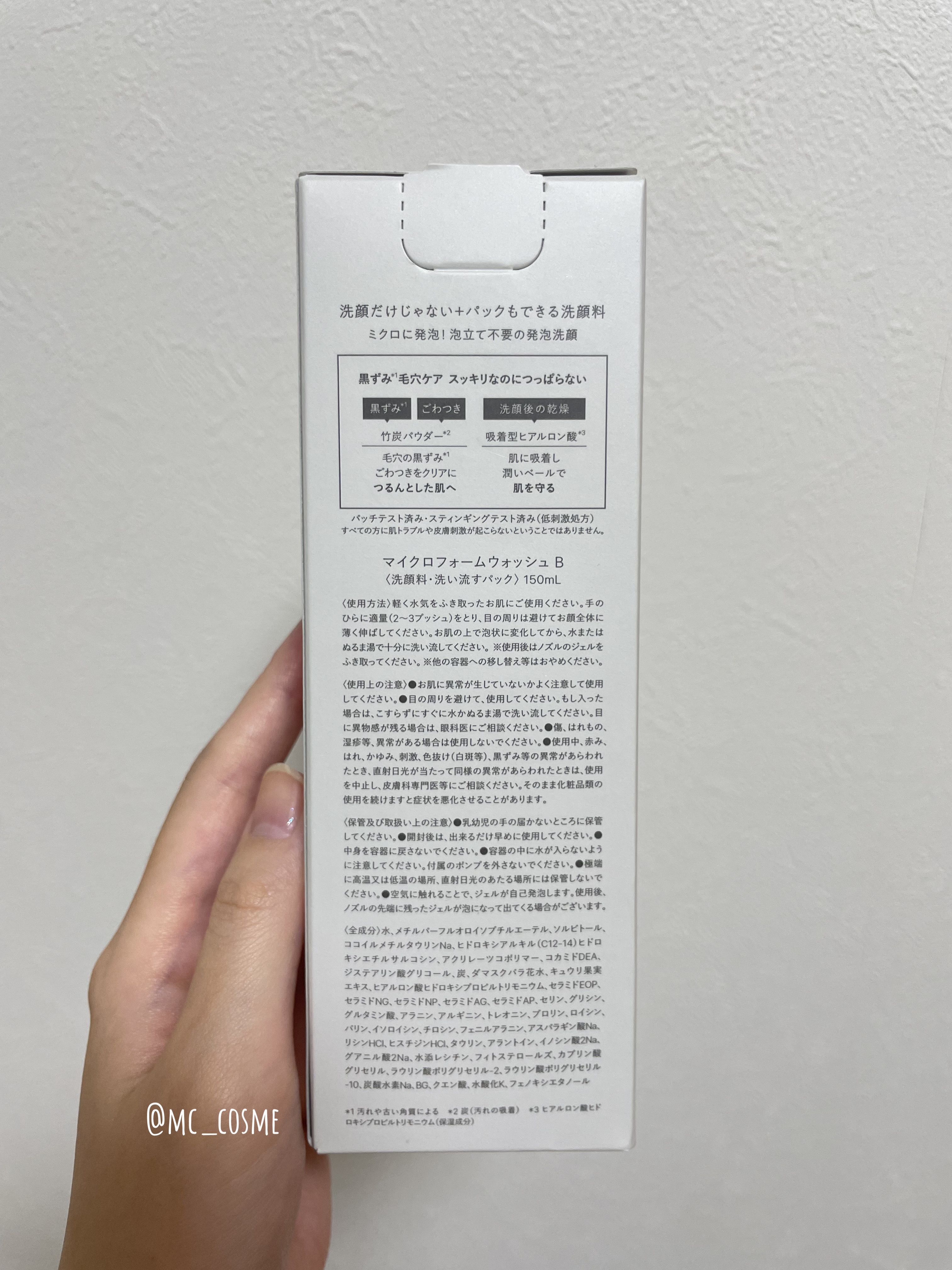 - 販売名 :マイクロフォームウォッシュ B 日々蓄積される古い角質からくる肌のごわつきや、メイク汚れ、毛穴汚れを浮かせて落とす洗顔料です。洗顔と同時に毛穴パックとしても使用することができ、毎日使うことで肌のコンディションを整えます。毎日の洗顔で時間をかけずに、手軽にスペシャルケアを行うことが可能です。
