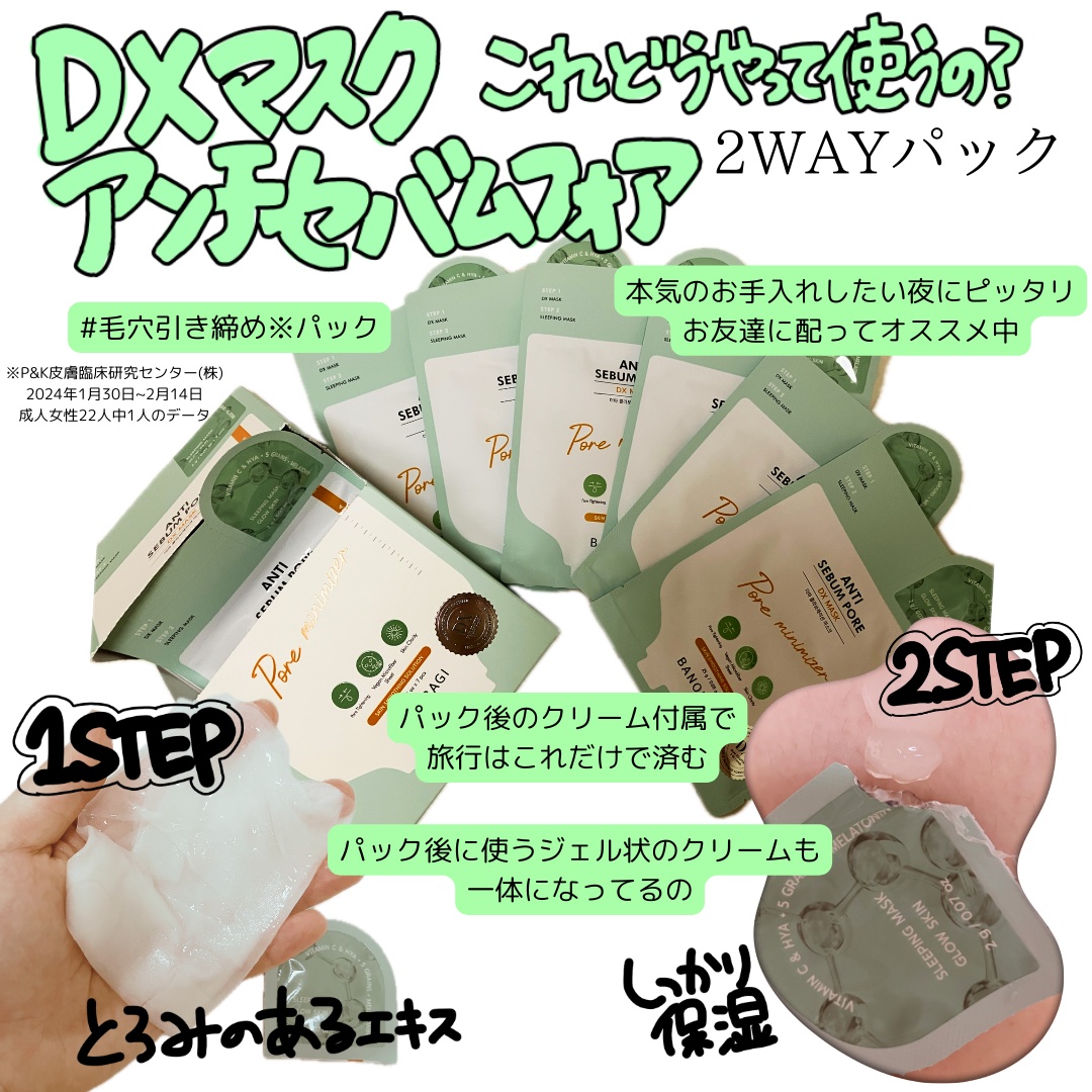- 眠っている肌のポテンシャルを目覚めさせる! SKIN POTENTIAL UP!お肌のお悩みオーダーメイド 2in1マスク 【全5種類】 AC&AC スポット 効能 : #緊急鎮静 #トラブル鎮静 #水分供給 剤形 : さわやかでしっとりした透明感のあるエッセンス スリーピングマスク(製剤) : べたつかない半透明ゲル、素早く吸収 アンチ セボム フォア 効能 : #もちもち毛穴 #皮脂調節 #アンチセボム #角質ケア 剤形 : さわやかでしっとりした薄い黄色のエッセンス スリーピングマスク(製剤) : べたつかない半透明ゲル、素早く吸収 カフェイン&ファーミング 効能 : #タンタン保湿 #もちもち弾力 #リフティング #弾力ケア 剤形 : さわやかでしっとりした透明感のあるエッセンス スリーピングマスク(製剤) : べたつかない半透明ゲル、素早く吸収 ヒヤ アクアフレックス 効能 : #水分たっぷり #肌のキメケア #バリアケア #きめ細かい保湿 剤形 : 水分たっぷりのクリームエッセンス スリーピングマスク(製剤) : べたつかない半透明ゲル、素早く吸収 ブライト & ヤング 効能 : #童顔肌 #さわやか感触 #ブライトニング #抗酸化 剤形 : 半透明、しっとりしたエマルジョンエッセンス スリーピングマスク(製剤) : べたつかない半透明ゲル、素早く吸収