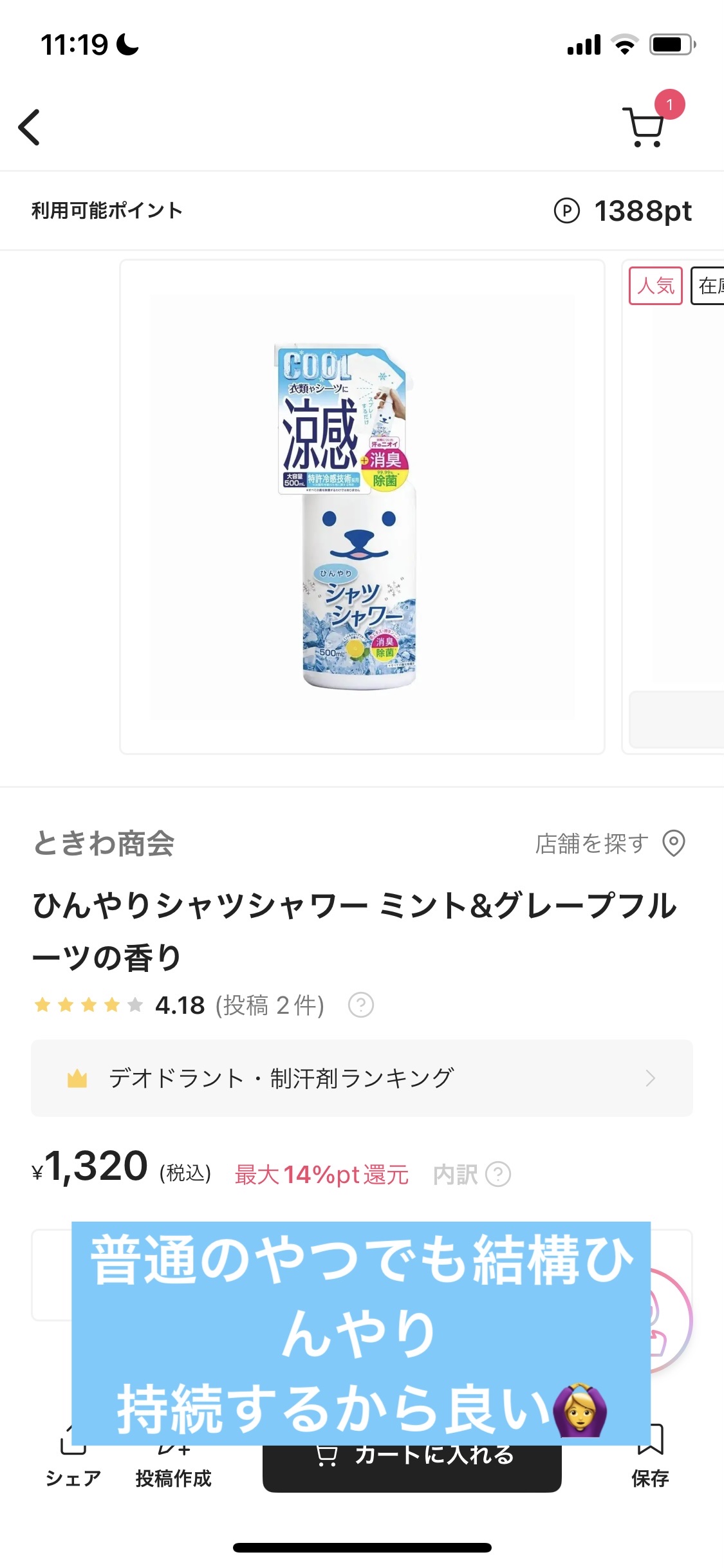 | 服にスプレーするとすぐに涼感あって良い!暑い日に涼しい〜!お外に出る前にかけると暑さ緩和されて良い感じ | 詳細を見る | |
