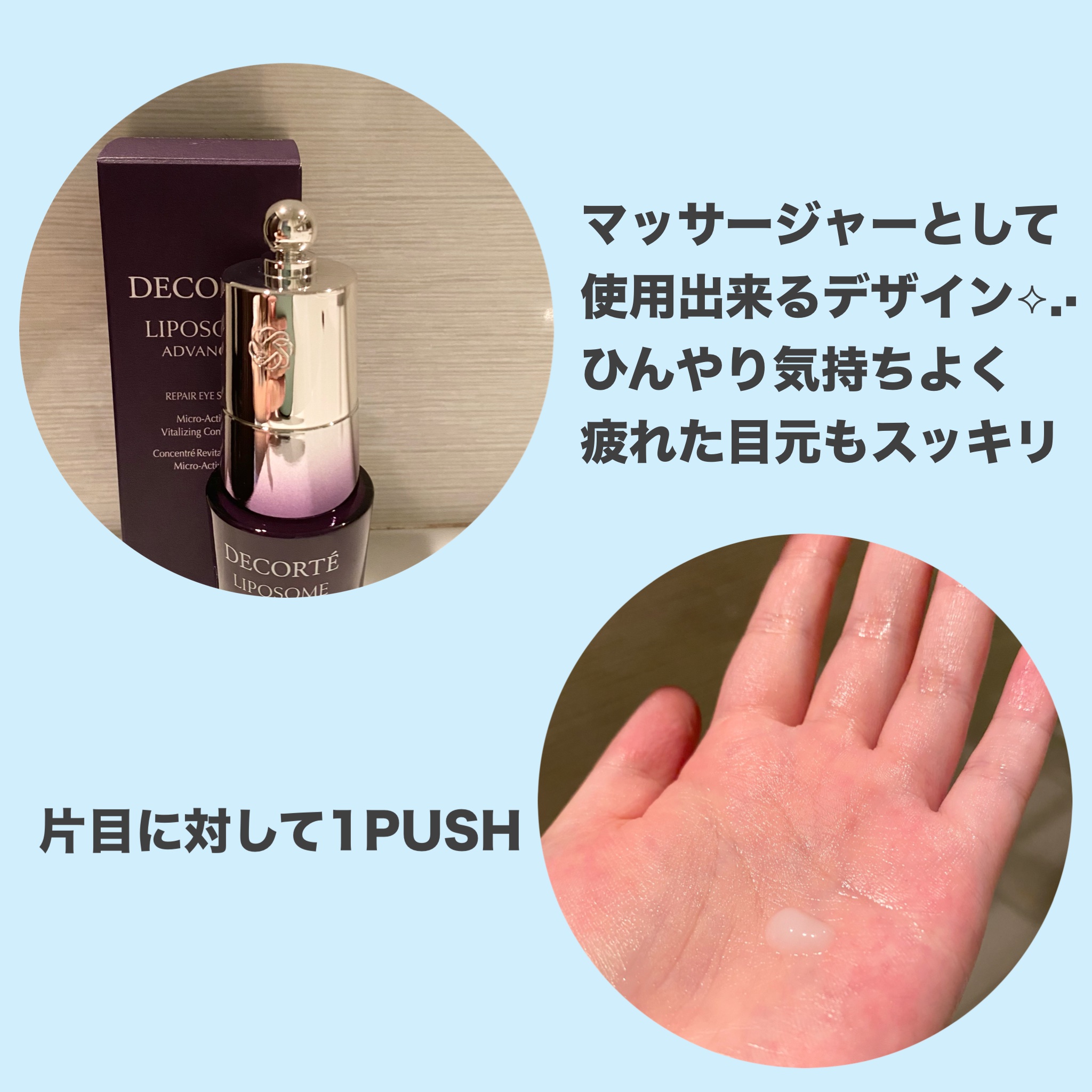 ◾️DECORTÉリポソームアドバンストリペアアイセラム乾燥によるくすみ、キメの乱れ、ハリのなさ、乾燥小ジワなど、疲れた目もとにアプローチしてくれる!デリケートな目もとにすっとなじむ、オイルフリーのみずみずしいエッセンスベースプッシュ式で、片...