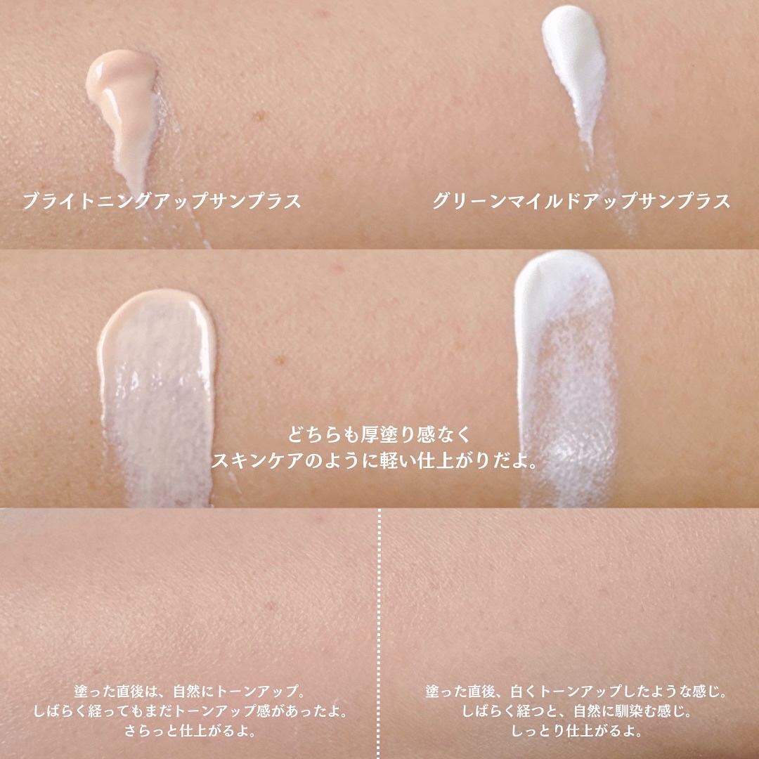 グリーンマイルドアップサンプラスはノンケミカル処方で敏感肌も使える ブライトニングアップサンプラスは化粧下地として使える肌馴染みのいいピンクベージュ どっちを選んでも損はないし、迷ったらどっちも買っとけ!が正直な感想😆