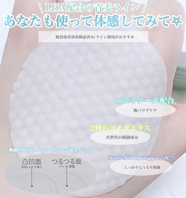 青麦に含まれるB-グルカンはヒアルロン酸より水分貯蔵能力が20%以上優れていると評価されている次世代保湿成分💚 みんな大好きオリーブヤングやファへでもランキング1位🥇を獲得しているよ⟡.· しっかり厚みのある、片面ぽこぽこのパッド.•♬ 朝洗顔の代わりの拭き取りや、お肌に水分を入れ込みたいときのパック🧖♀️に、メイク前の鎮静でメイクのりも⤴︎︎♡♡