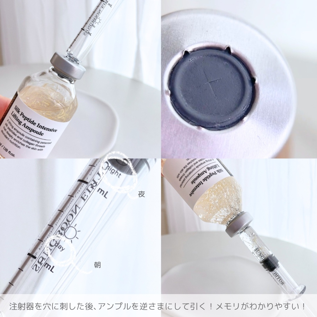 成分エディター様からいただきました❣️SUNGBOONEDITORシルクペプチドインテンシブリフティングアンプル注射器で適量を取り出して使うよ😳乾燥を防いでしっとりした肌へコラーゲン糸が入っていてすごっ❣️肌をカバーするように密着、ペタッとし...
