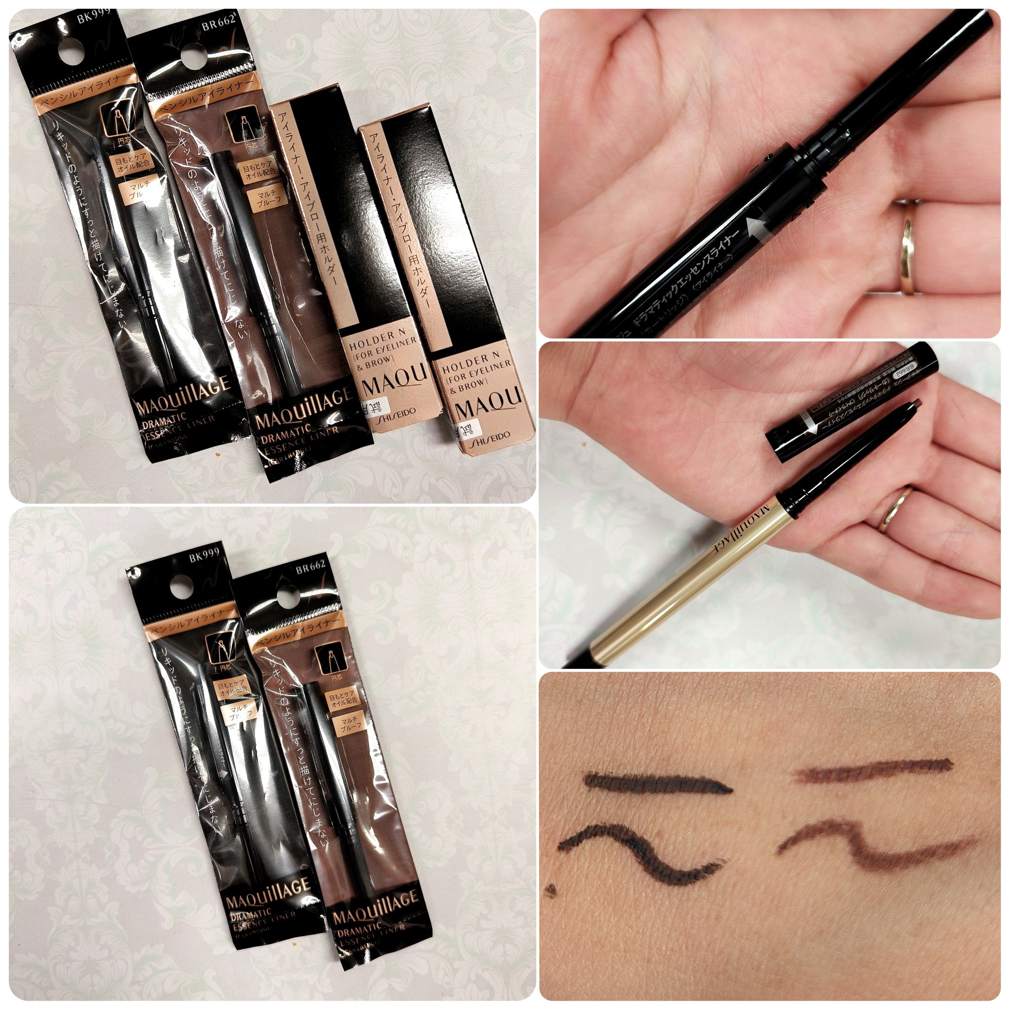 - やみつき するする自在の描き心地で、1日中続く* とろけアイライナー * 13 時間 化粧もち (色持ち・にじみのなさ)データ取得済み(定番3色) (当社調べ。効果には個人差があります。) ※別売りの「マキアージュ アイライナー&ブロー用ホルダー N」にセットしてお使いください。 〇肌どけプルーフ処方 するするとなめらかな描き心地で、細いラインが安定して描ける。 マルチプルーフ効果で、汗・水・皮脂・こすれに強く長時間にじみにくい。* *定番3色 〇5種の目もとケアオイル配合* まぶたに負担をかけずになめらかに広がり、うるおいを与えながら肌に密着。 *ツバキオイル、シアオイル、アルガンオイル、マカデミアナッツオイル、ベニバナオイル (保湿)