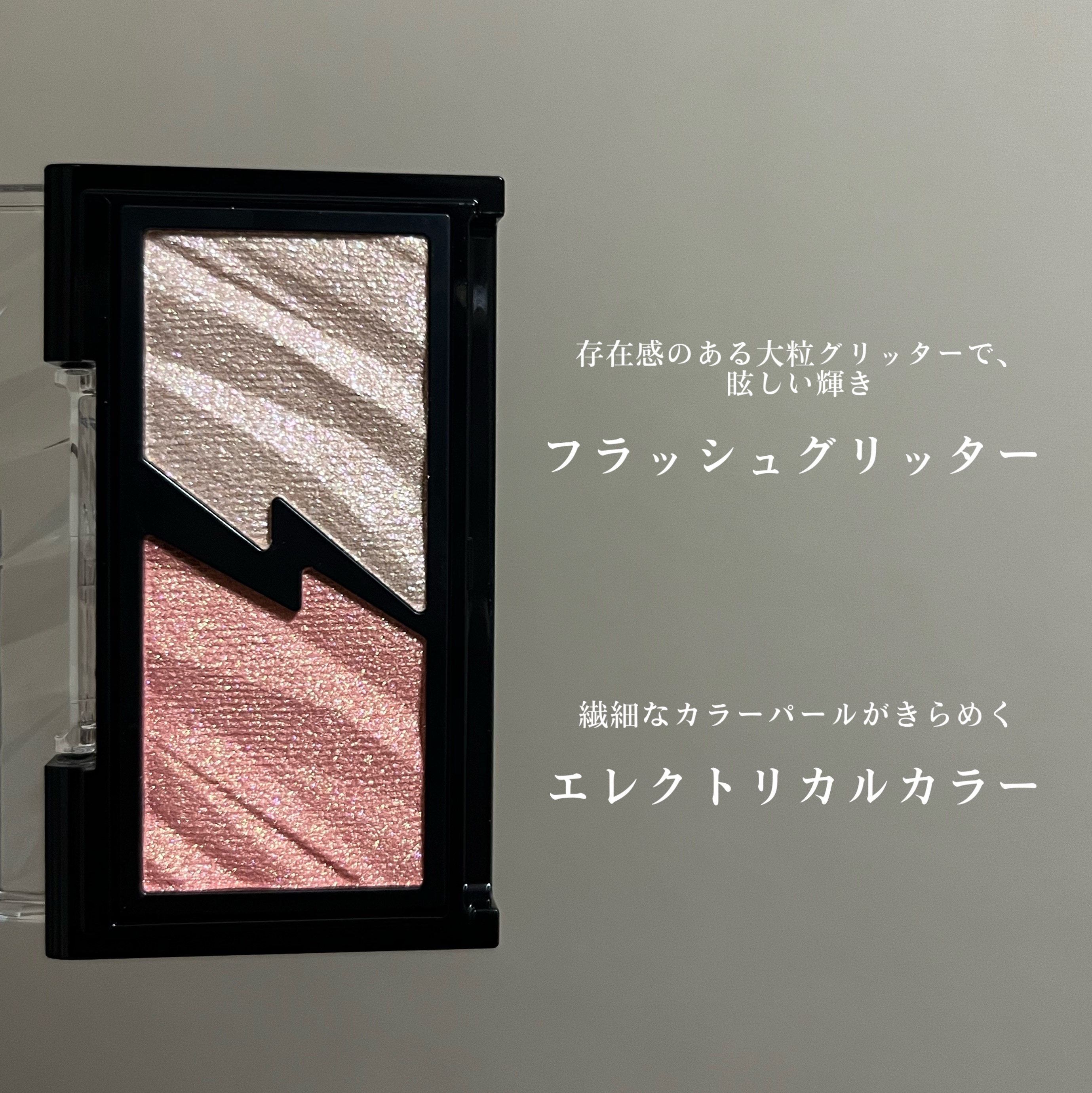 - 質感の違う2つの輝きで火花がクラッシュしたような発光感のある目元印象をつくるアイシャドウ。 まぶたにピタッと密着して、大粒ラメも落ちにくい処方設計。 繊細なカラーパールがきらめくエレクトリカルカラーと存在感のある大粒グリッターでまぶしい輝きを演出するフラッシュグリッターの2つの質感を掛け合わせて、輝き自由自在。 目元以外にも頬や鼻筋のハイライトに使える。
