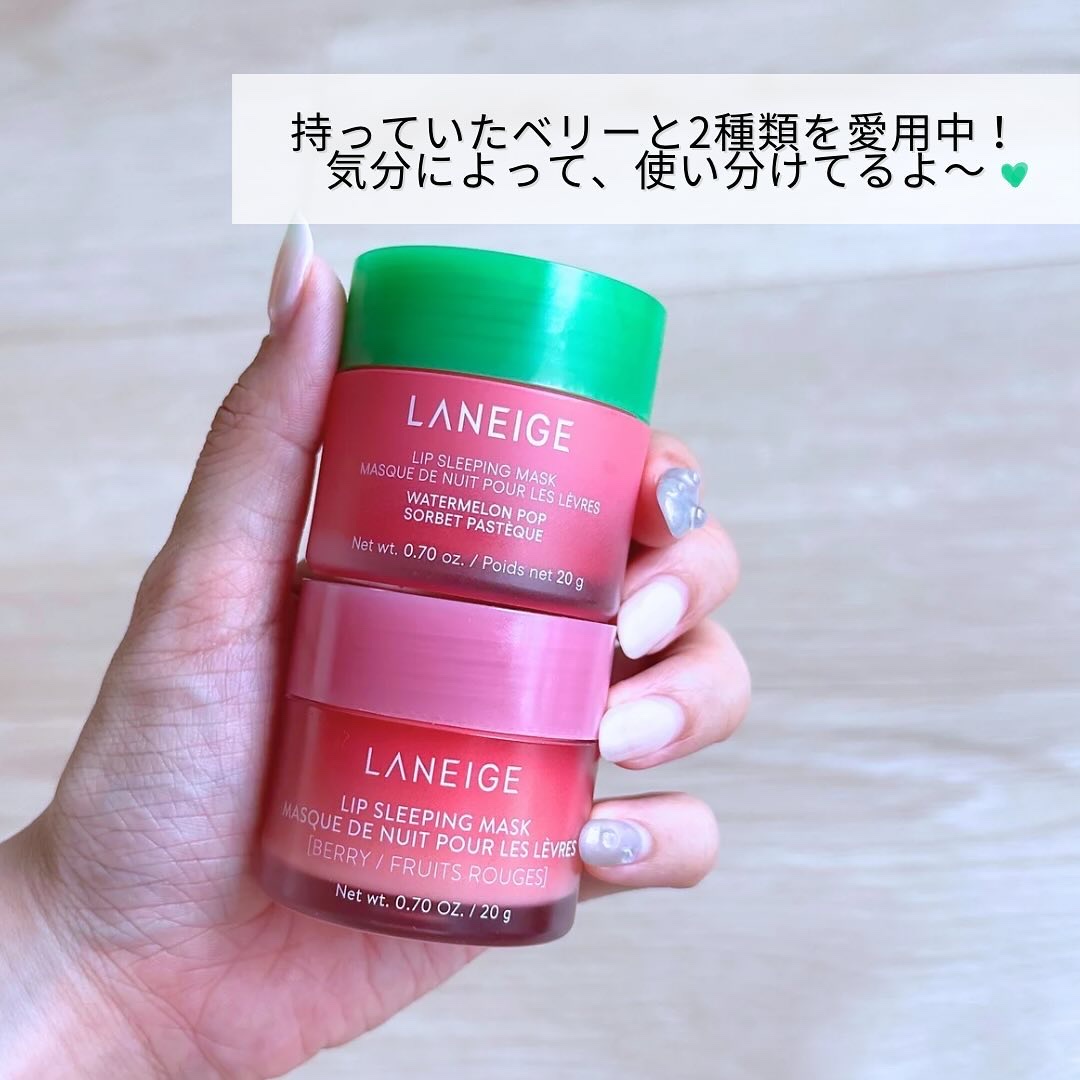 - 寝ている間にケアしてふっくらぷるぷるにうるおった唇へ。 2015年の初代発売以降、世界で2秒に1個売れている*¹LANEIGE大ヒットシリーズ *¹ 2024年グローバル販売実績 1.角質にアプローチするBerryFruitComplex (ベリーフルーツコンプレックス)*²が、 寝ている間に気になる乾燥や角質にうるおいを与え、つやのあるふっくらとうるおった唇に仕上げます。 *²ザクロ果実エキス、ブドウ果実エキス、ラズベリー果実エキス 2.ココナッツオイル(ヤシ油)を配合で、うるおいをあたえ睡眠中の乾燥を防ぎます。 3.今夜はどんな気分?5つのフレーバーから選べるワクワク感。 ■テクスチャー:やさしく馴染むなめらかなバームタイプ ■アレルギーテスト済み*³ *³全ての方にアレルギーが起こらないということではありません。 ■使用方法 寝る前に唇にたっぷり塗り、そのままお休みください。 翌朝、軽くティッシュオフします。付属のスパチュラで塗ることで、より唇の角質に馴染みやすくなります。 日中のリップトリートメントにも使用できます。