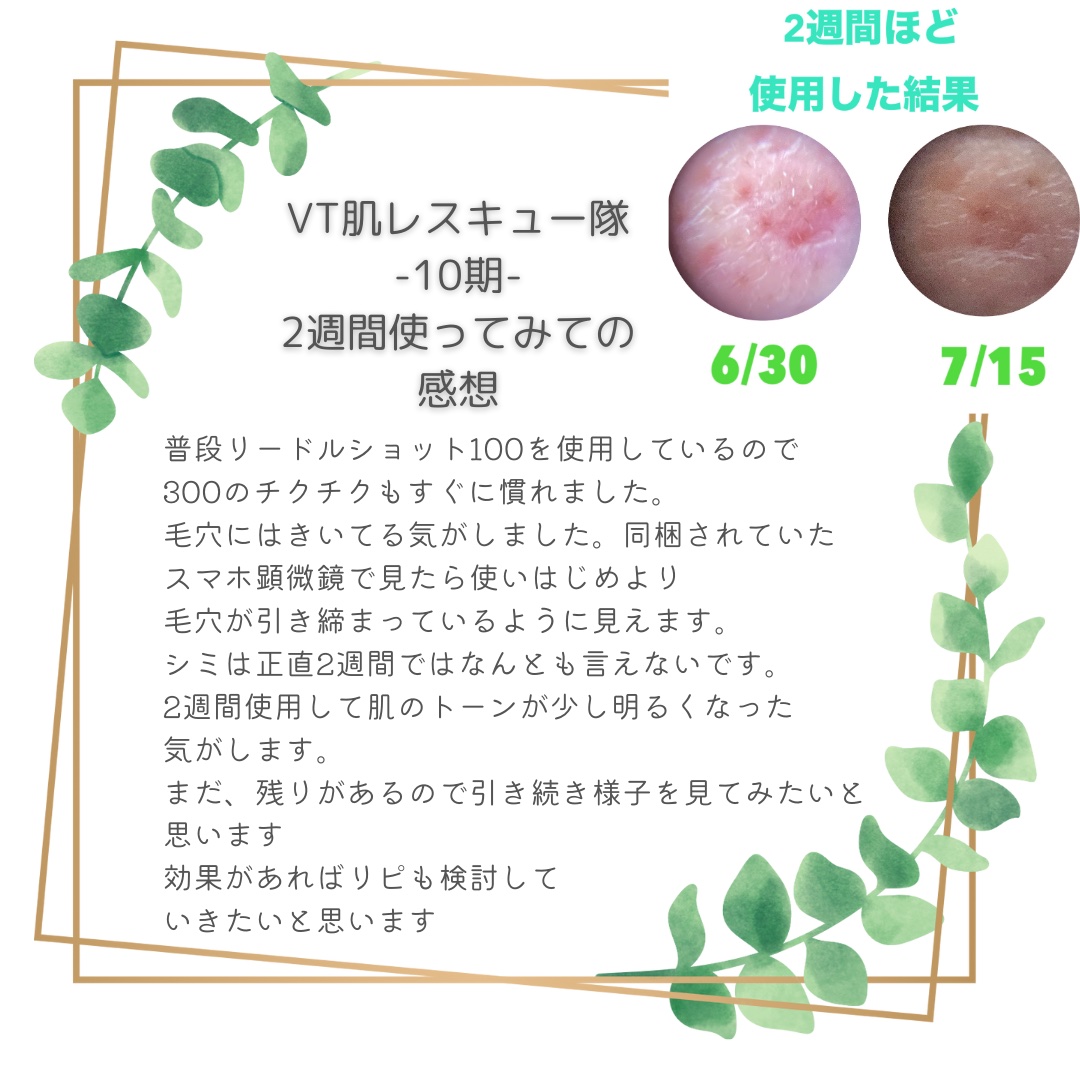 普段リードルショット100を使用しているので300のチクチクもすぐに慣れました。毛穴にはきいてる気がしました。 肌のトーンが少し明るくなった気がします。 引き続き肌の変化を見守りたいと思います。