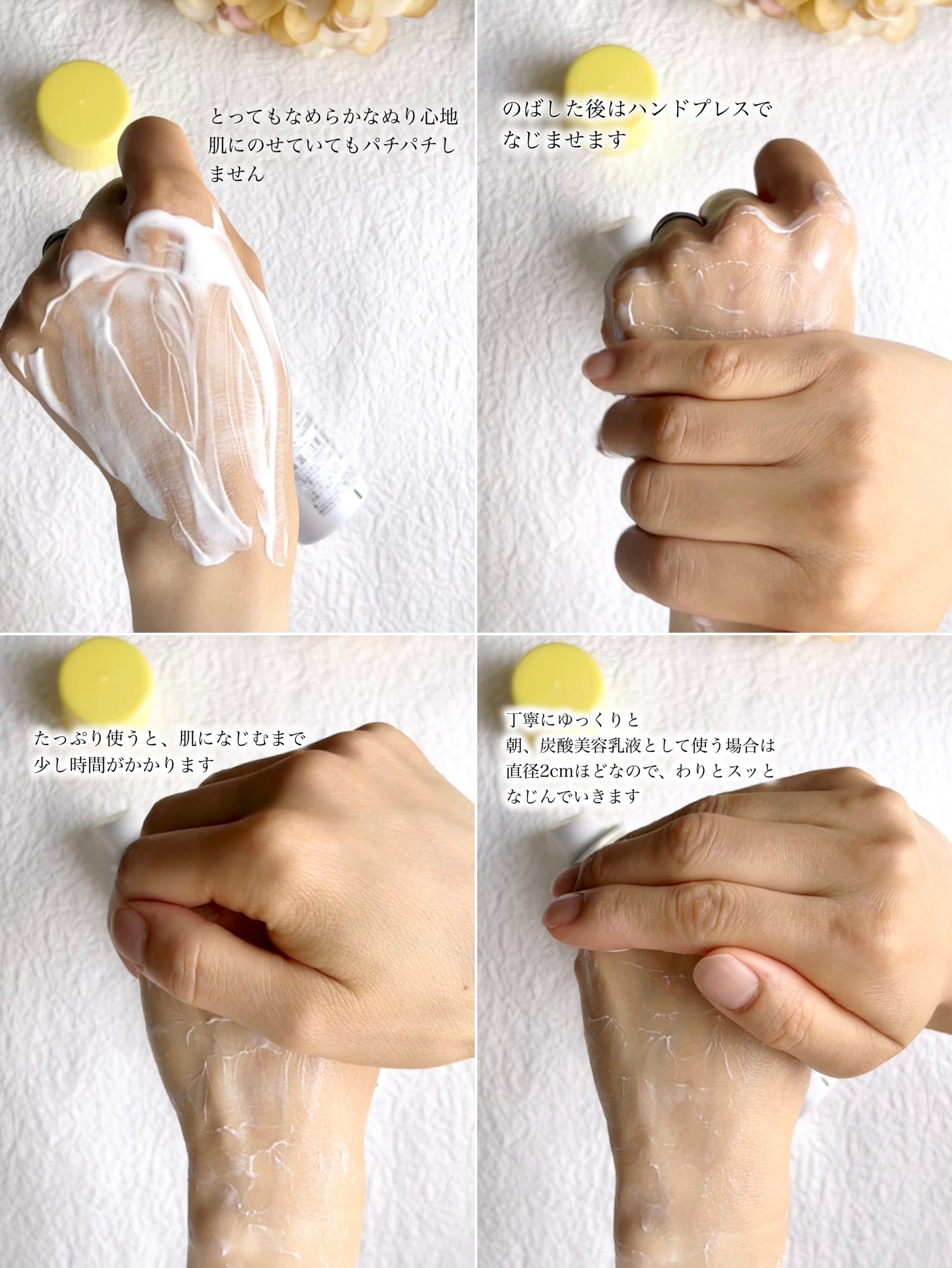 - 1:100%炭酸ガスの噴射剤でつくる、18,000ppm高濃度炭酸泡パック 18,000ppm※4の高濃度※1炭酸※2でつくった毛穴より小さいマイクロ炭酸泡で、機能成分の浸透※5をサポートします。 「HiCAミルクフォーム処方」で炭酸※2をミルク泡に閉じ込めているため、時間がたっても炭酸泡がキープし、炭酸を逃さず角質層に届けます。しゅわしゅわ・パチパチ弾けないのは、炭酸が外に逃げていない証です。 炭酸により血行が促進し、一時的に肌が赤くなります。 高濃度炭酸の特徴ですので問題はありません。 2:ビタミンC+話題の美容成分で毛穴※6・くすみ※7を全方位ケア 本製品は“速攻型”ビタミンC誘導体 であるビタミンCエチル※3を1%配合し、炭酸泡パックのパワーを後押しします。ビタミンCエチル※3 は肌にある酵素と反応することなく、そのままの形で効果を発揮するビタミンC誘導体のため、 素早くお肌に届きます※5。 その他、肌をひきしめツヤを与えるナイアシンアミド※8、パンテノール※8、グルコシルヘスペリジン※8など美容成分たっぷりと配合し、気になる毛穴※6・くすみ※7の全方位ケアが叶います。 3:肌悩みや生活スタイルにあわせて、使い方いろいろ 1.洗い流し不要だから簡単手軽!1日5分の炭酸パック 化粧水で肌を整えた後、直径4cmほどの泡を手に取り、顔全体に厚めに広げます。5分ほどパックした後、手のひら全体で押し込むように肌になじませてください。洗い流しは不要ですが、肌残りが気になる場合は軽くティッシュオフしてください。 2.気になる目元や鼻の部分用パック 朝のどんよりした目元や、毛穴の気になる鼻・頬などへの部分用パックとしてもご使用いただけます。 3.炭酸美容乳液として手軽な日常使いもOK 化粧水で肌を整えた後、直径2cmほどの泡を手に取ります。泡をつぶさないように顔にのせ、やさしく顔全体に広げてから、押し込むように肌になじませてください。 ※1 自社比 ※2 炭酸ガス(噴射剤)※3 3-O-エチルアスコルビン酸(整肌成分) ※4 理論値 ※5 角質層まで ※6 皮膚にうるおいを与え、乾燥による毛穴を目立たなくする ※7 乾燥によりキメが乱れた肌印象 ※8 すべて整肌成分 2024年6月20日 オンラインストア 2024年7月中旬 全国のロフトおよびロフトネットストア、ハンズおよびハンズネットにて順次販売を開始(一部店舗を除く)