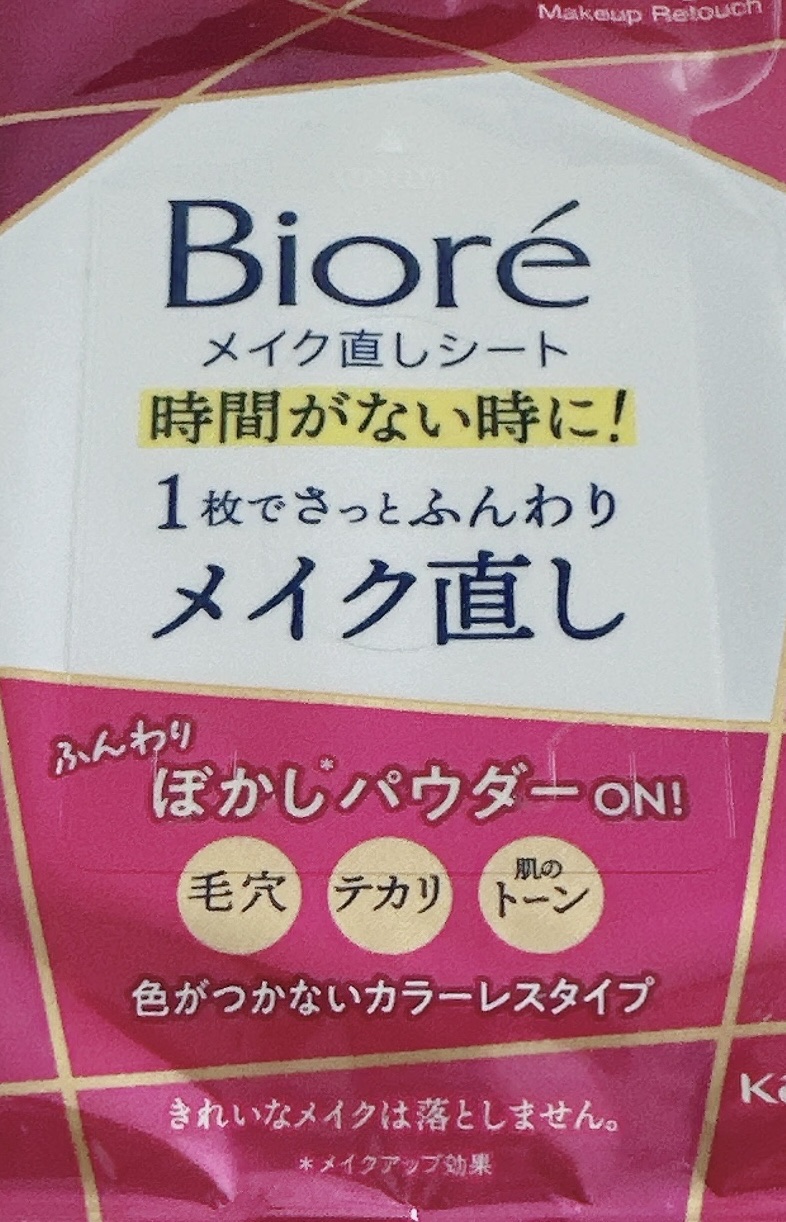 - <ビオレ メイク直しシート> 水、シリカ、エタノール、BG、酸化チタン、(アクリレーツ/アクリル酸アルキル(C10-30))クロスポリマー、PEG-60水添ヒマシ油、ラウレス-6、EDTA-2Na、水酸化K、フェノキシエタノール、メチルパラベン、エチルパラベン