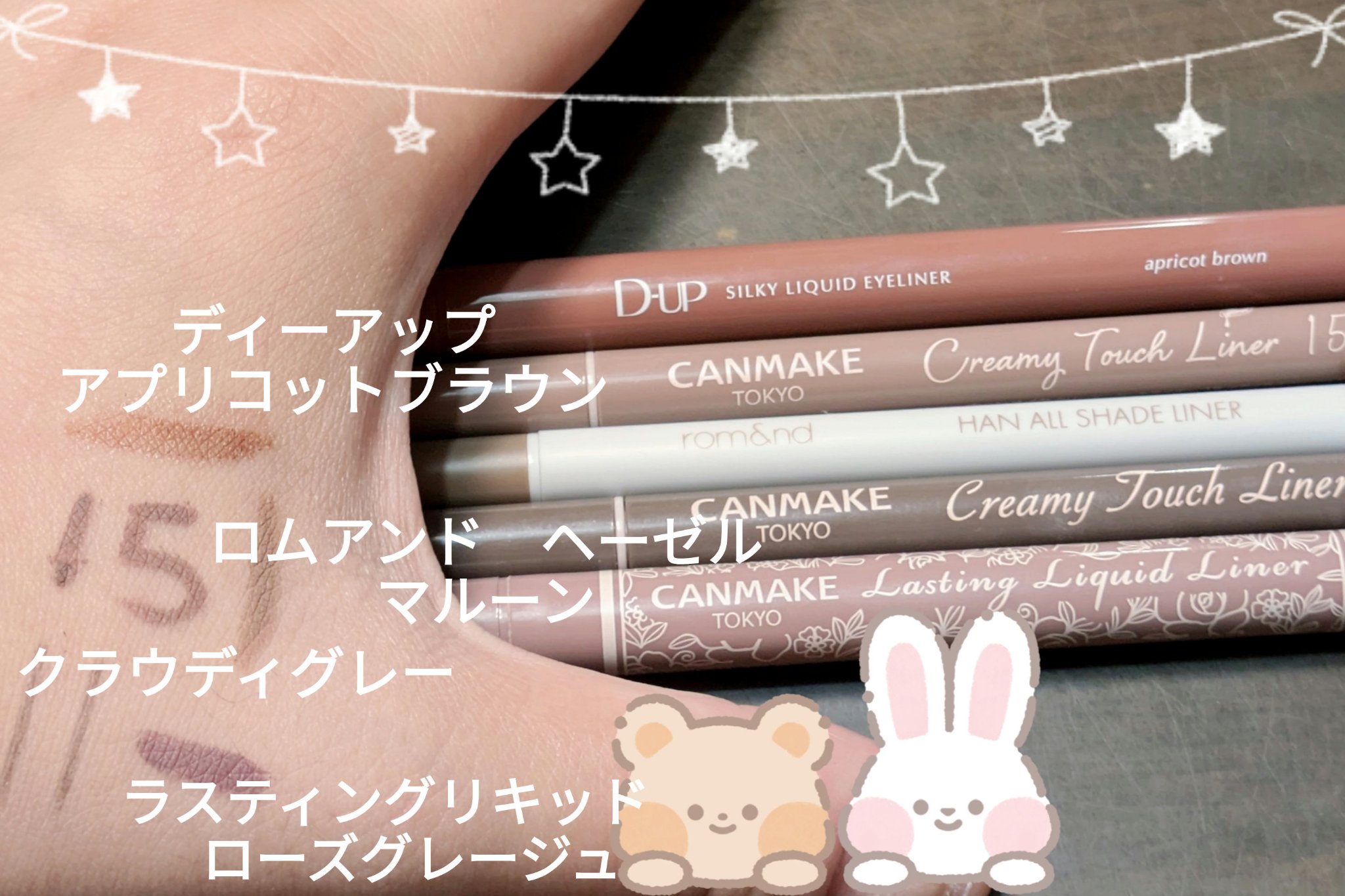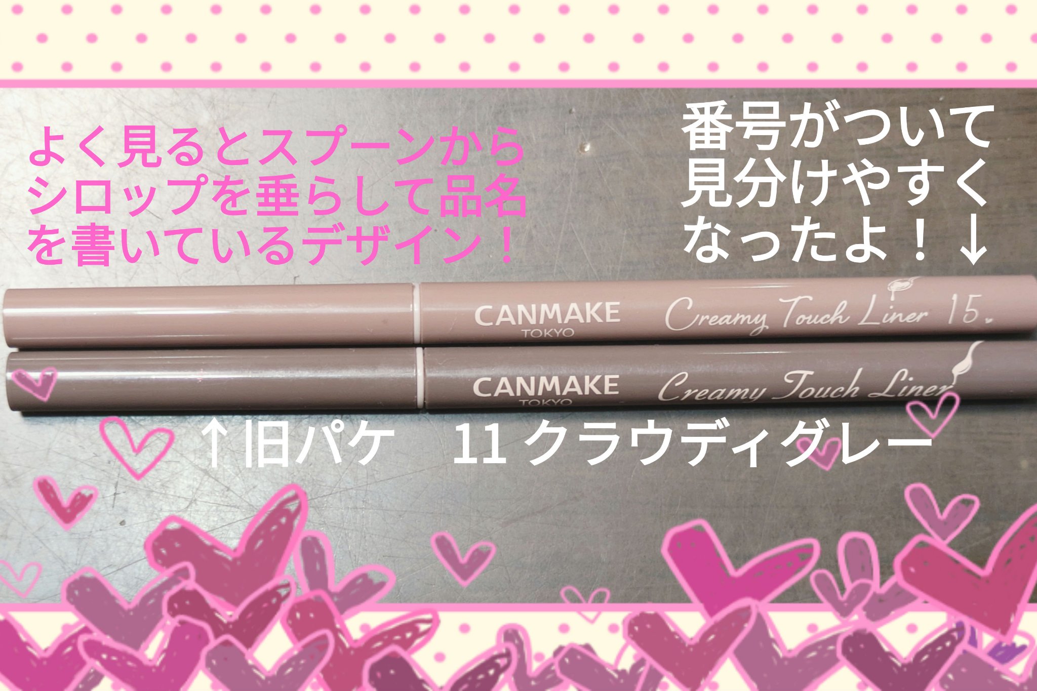 名前の通り黒。一番目元をくっきりさせたい時はこれ。 濃いブラウン。ブラウンで締めたい時はこれ。とはいえ、02を使うので使用率低め。 オレンジ🍊のようなキャラメルカラー。オレンジや黄味が強い時はこれを使います。 濃いめの紫。秋メイクでは出番が多い。 可愛すぎるピンク。ミルキーなピンクブラウンなナチュラルに可愛い。下瞼の粘膜はこれしか使ってないぐらい好き💕これも何本もリピ。 グレー。これも使いやすい!!上瞼は悩んだらこれを使っておけばなんとかなるカラー。黒のようにパキッとしすぎないので、自然に目力アップする😀 鮮やかなピンク。春夏にはぴったりのカラー😍 ミルキーコーラルのようなカラー。これも可愛い😍。アイラインとして線がパキッと出るわけではないので、ほんのり際に仕込んでます. 10より黄味がないので、ミルキーなカプチーノぽいカラーが本当に使いやすい。最近はこれが一番好き💕そして1番出番が多い。
