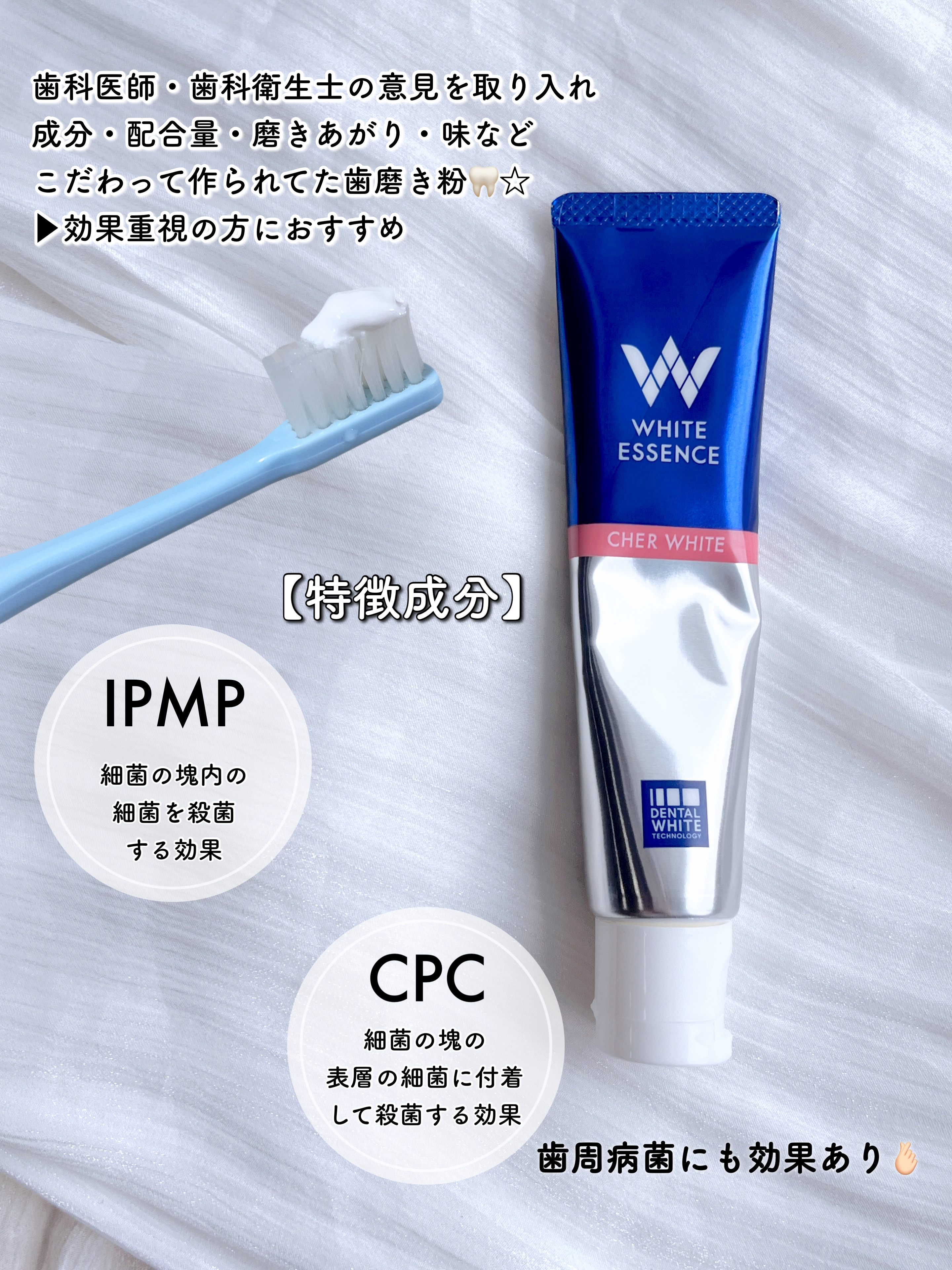 - 【医薬部外品】 全国 275* の歯科医院をフランチャイズ運営し、歯のホワイトニングやクリーニングなどのサービスを展開するホワイトエッセンスが開発。 「口臭の原因を磨いて落とす」 イソプロピルメチルフェノール(IPMP)と塩化セチルピリジウム(CPC)に加え 8つの薬用成分を配合した口臭ケア歯磨き粉。歯周病菌だけでなく臭いの元となる菌を殺菌し、口臭を防止します。 *2024年3月末時点