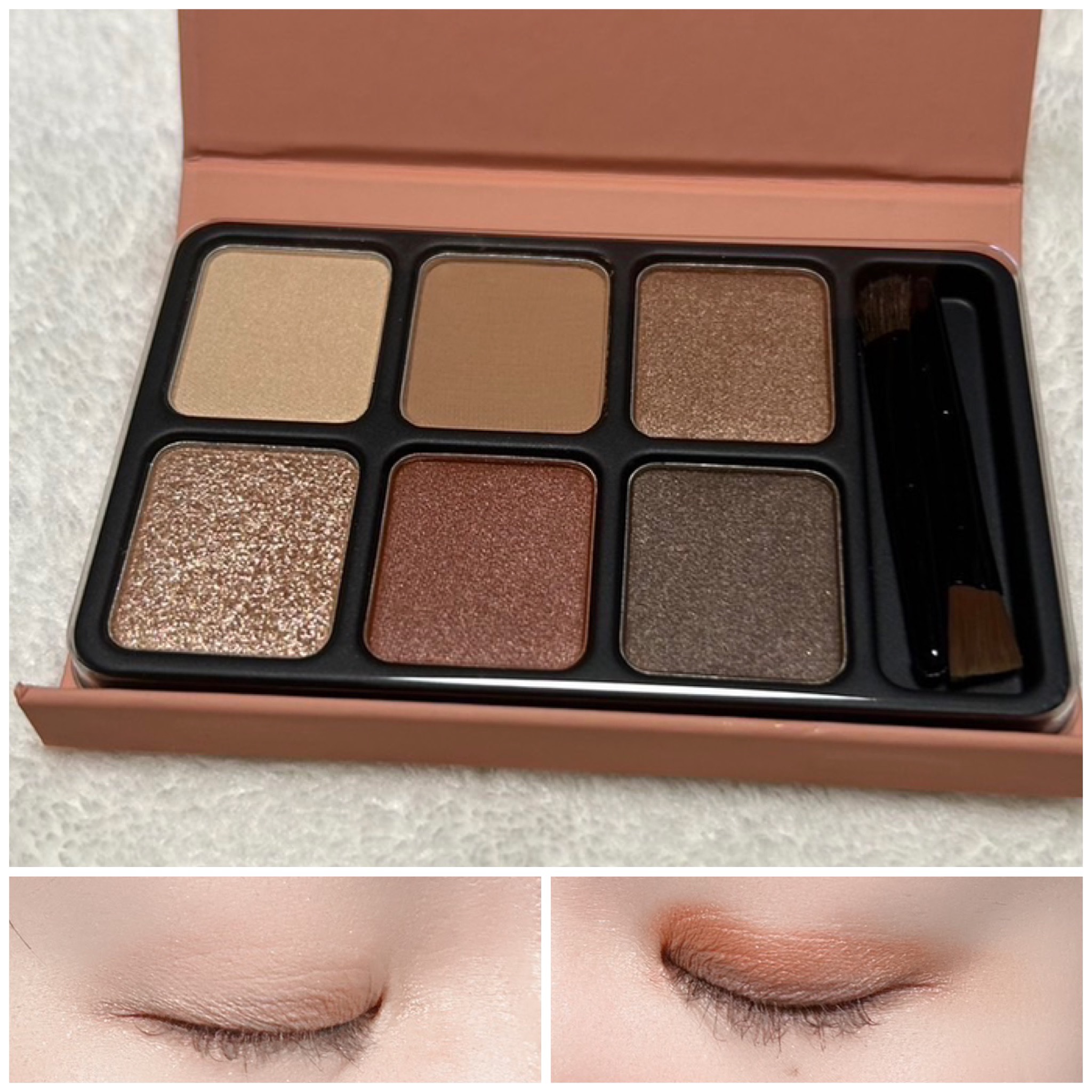 14.キャラメルブラーリング 悩んだら縦で使えば悩まない!との事で縦に使ってみたのですが、4パターン全て違くて同じブラウンメイクでも楽しめます! ベースカラー、中間色、締め色全て少しずつ違うので縦で使わなくても色々なカラーバリエーションを楽しめます! 14は普段使いしやすい色ばかりなので#スクールメイク や#オフィスメイク としても使えますし、ラメを使えば華やかな印象にもなるのでどんなシーンでも使えるかなと思いました! パレット自体は薄いですが、大きさがあるので持ち運びだとバックによるかなと思うので、お直ししたいと思った時はバックを考えるか、その時は違うパレットを使うのがいいのかなと思います!
