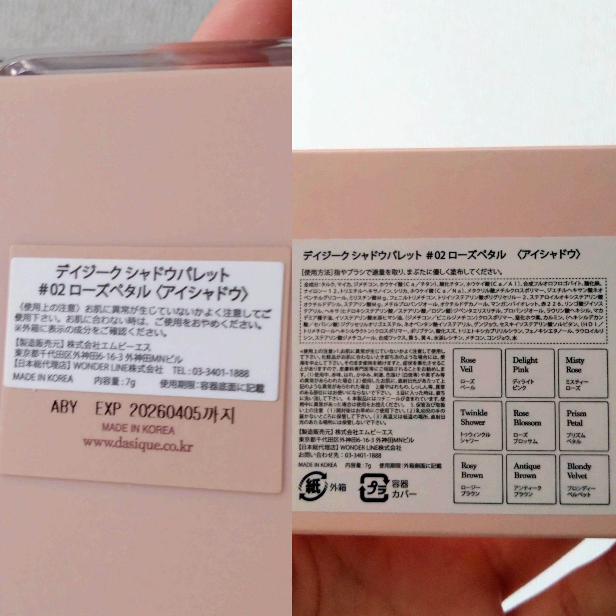 - 【舞台上のバレリーナの繊細な動きと抑制された美しさを再解釈した、dasiqueならではのバレエコアコレクション】 シマー、マット、パールなどバリエーション豊かなテクスチャーで、軽やかにまぶたにフィット。粉飛びしにくく、指先で簡単に美しい仕上がりが叶います。 柔らかいピンクベースから深みのあるシェードまで揃い、1つのパレットで普段使いのデイリーメイクから特別な日の華やかメイクまで幅広く楽しめます。 - 活用しやすいテクスチャーとカラーバリエーションで毎日新しいムードを完成してくれるデイジーク シャドウパレット。 デイリーメイクからポイントメイクまで演出が可能。 感覚的な9種類の色味でムードUP! 多彩でウェアラブルなテクスチャーで高い活用度!