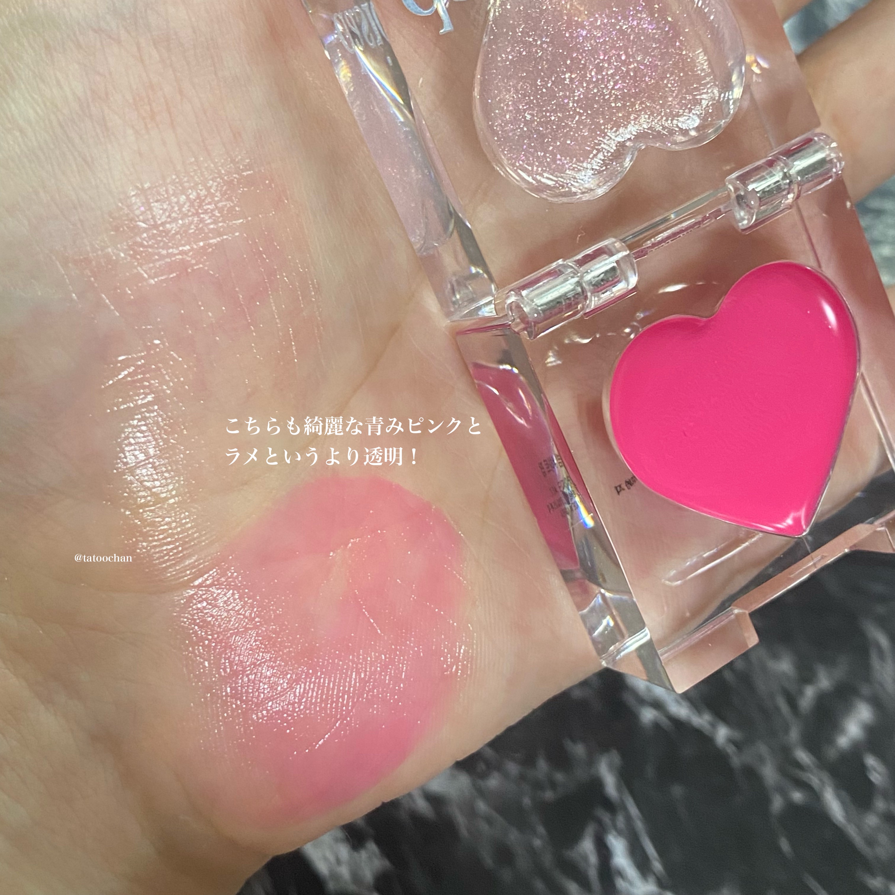 特に②のハートの部分が、綺麗な青みピンクで発色もかなりいいです! 透明感一気に出せるので、アイシャドウもピンクパープル系に合わせてしてみたら可愛い気がします! ブルベ夏カラーのものが本当に大好きなんですけど、これは2つともドンピシャでした!
