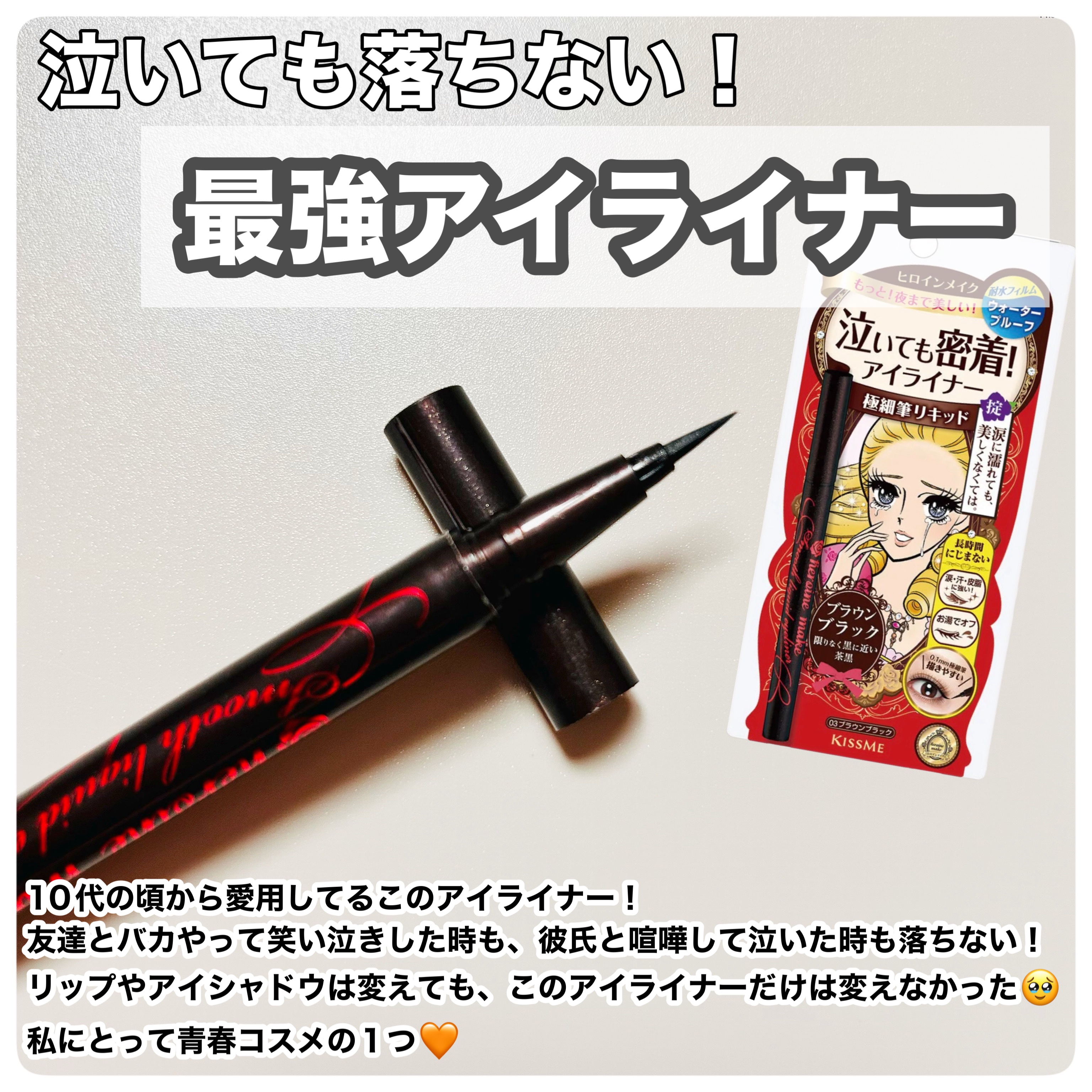 ヒロインメイクスムースリキッドアイライナースーパーキープ02ビターブラウン耐久性の高い処方でウォータープルーフで涙・汗・皮脂に強く美しいラインを長時間キープお湯オフというから買ってみたぁ細筆で描きやすい抜け感があるのでブラウン系、好きまぁまぁ...