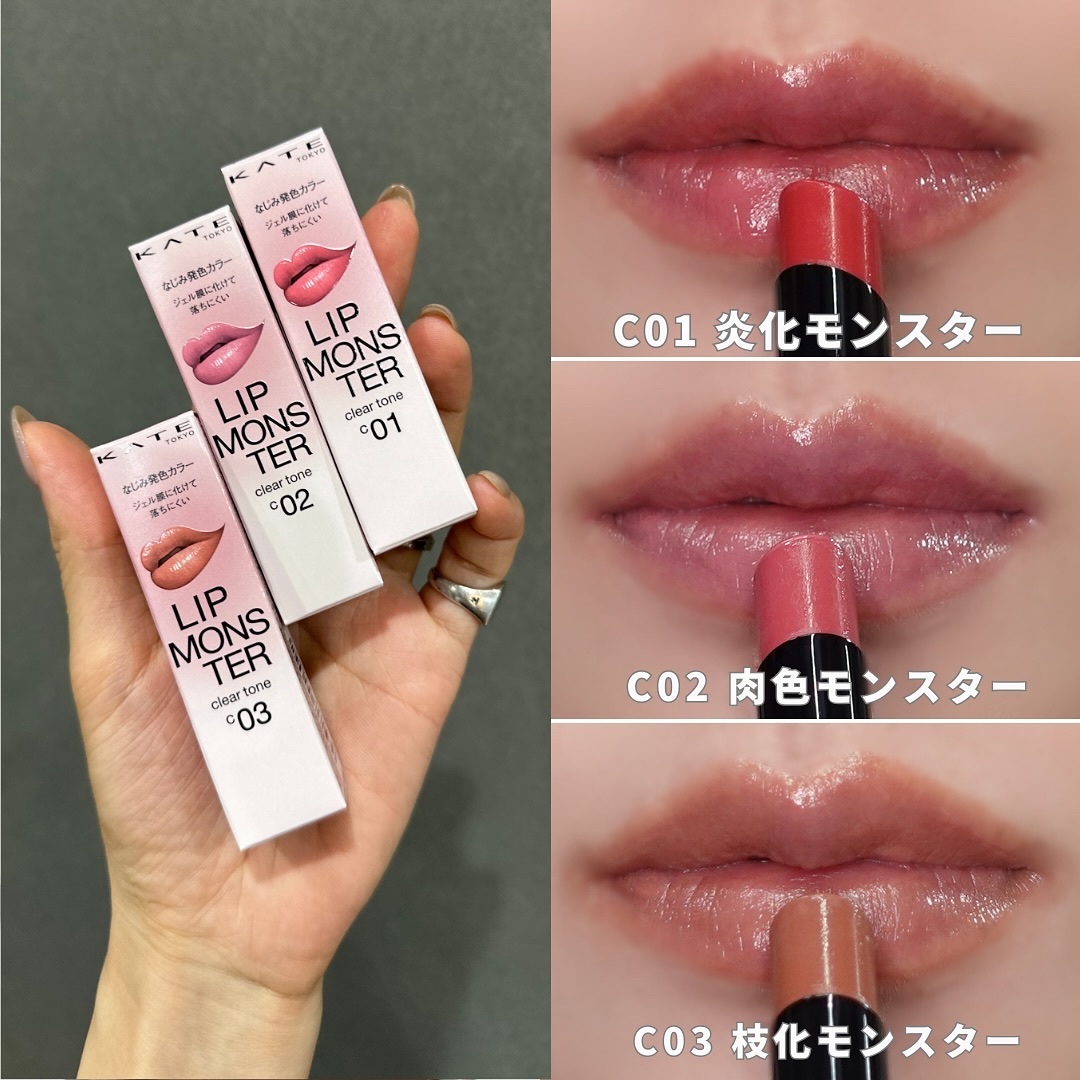 リプモンからシアーカラー#KATEリップモンスタークリアトーン✔︎C01炎化モンスター✔︎C02肉色モンスター✔︎C03枝化モンスター¥1,320円(税込)7/20発売!リプモンの色持ちはそのままになじみ発色のクリアカラーが登場〜!くすみは補...