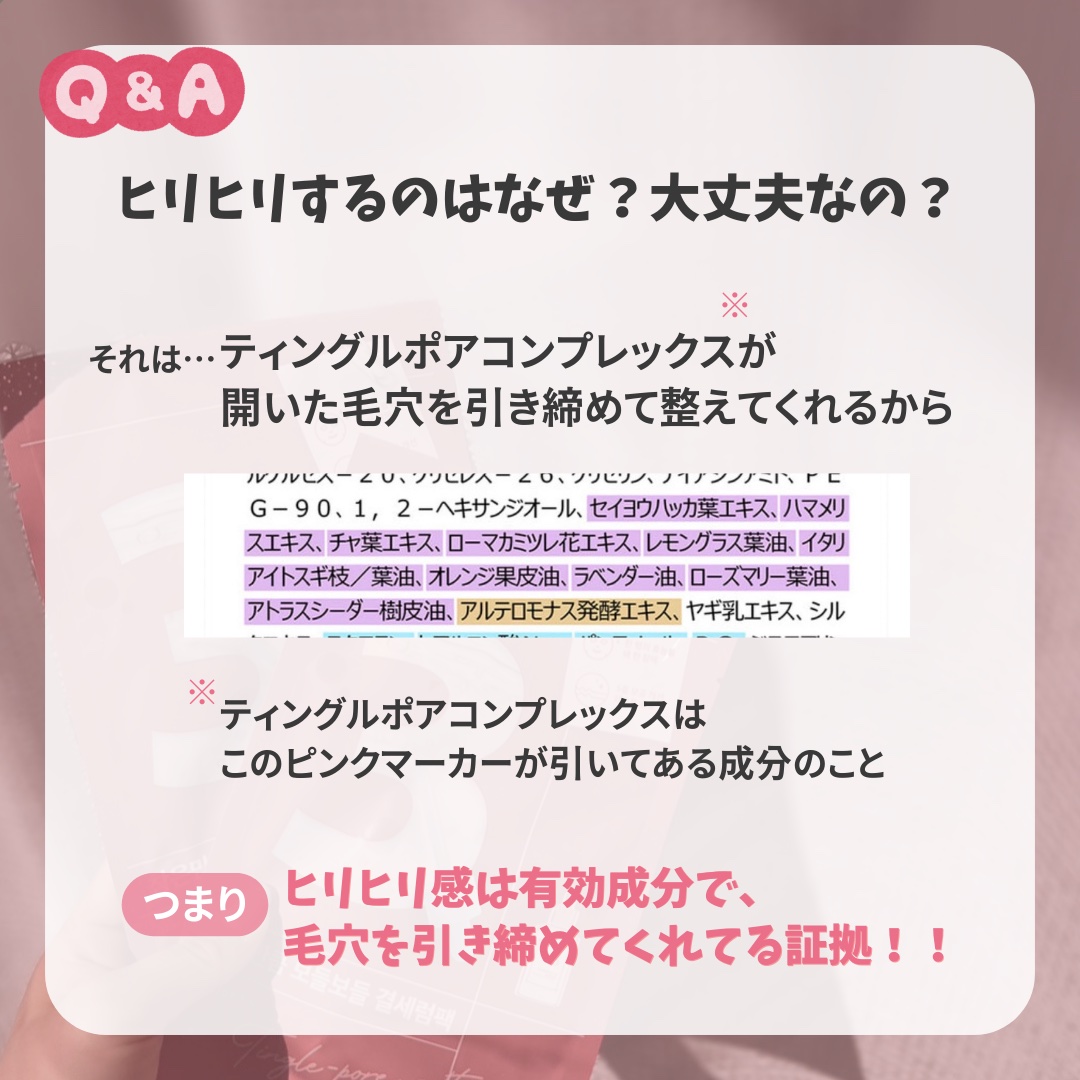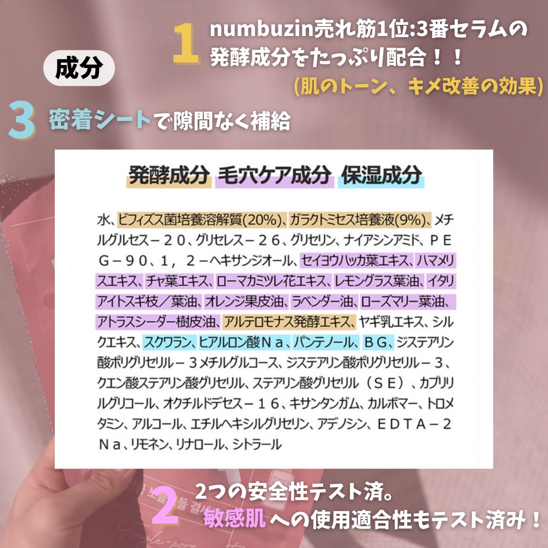 発酵成分と肌ひきしめ成分のW配合 ナンバーズイン3番セラムの濃縮された発酵成分を1枚に入れ込み集中ケア。 つけた時はなんの刺激もなく、5分位するとじんわり温かい少しヒリヒリっとするけど痛みは感じない程度でした❤️🔥👍🏻 確かに引き締め感は感じるけど、ピーリング後のようなツルツル感までは私は感じなかったです。