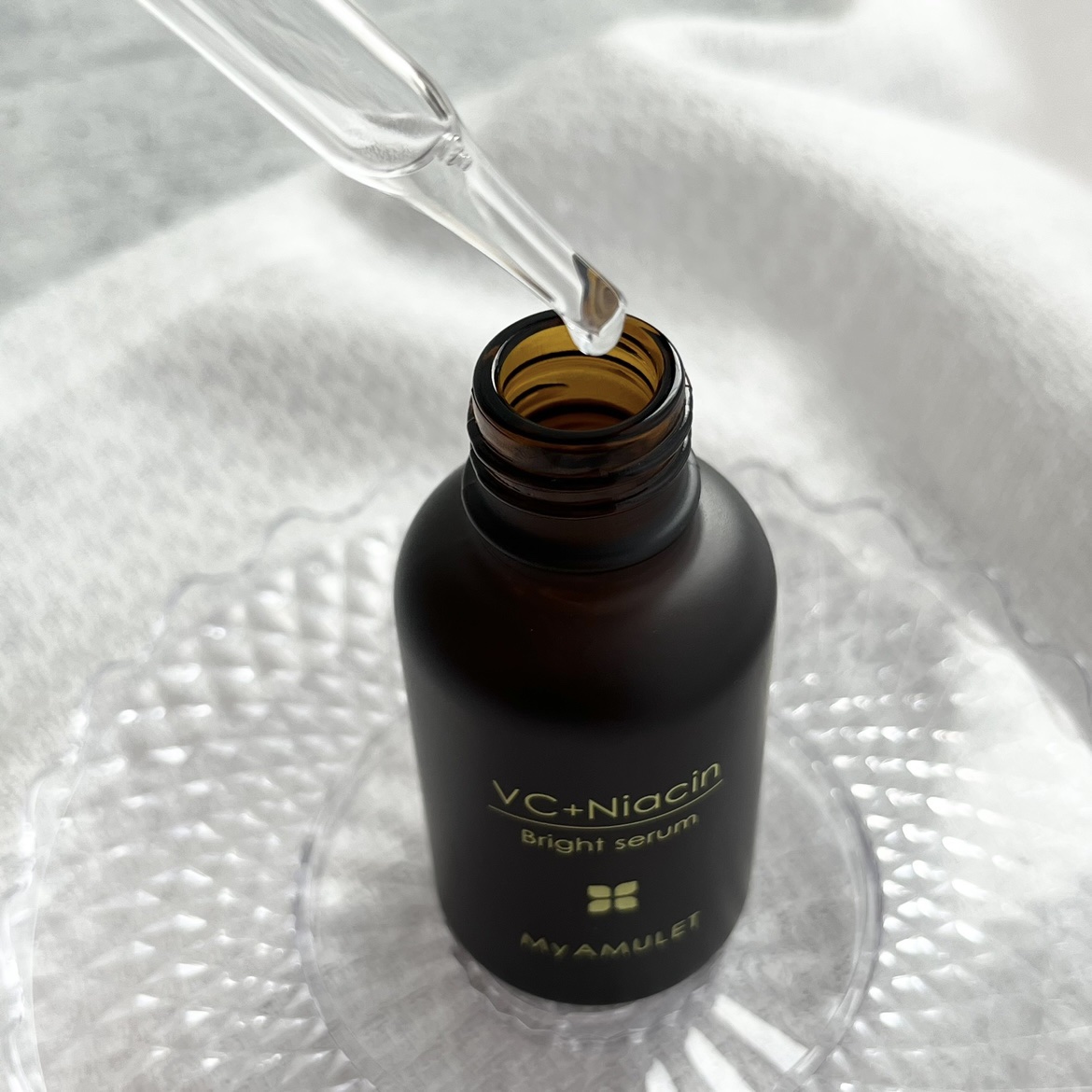 高機能ビタミンC誘導体のポアショット®を配合した、マイアミュレットの導入美容液。 なめらかな肌へサポートしてくれるんだって♡ テクスチャーはさらっとしていて、スーッとなじみの良い使い心地。