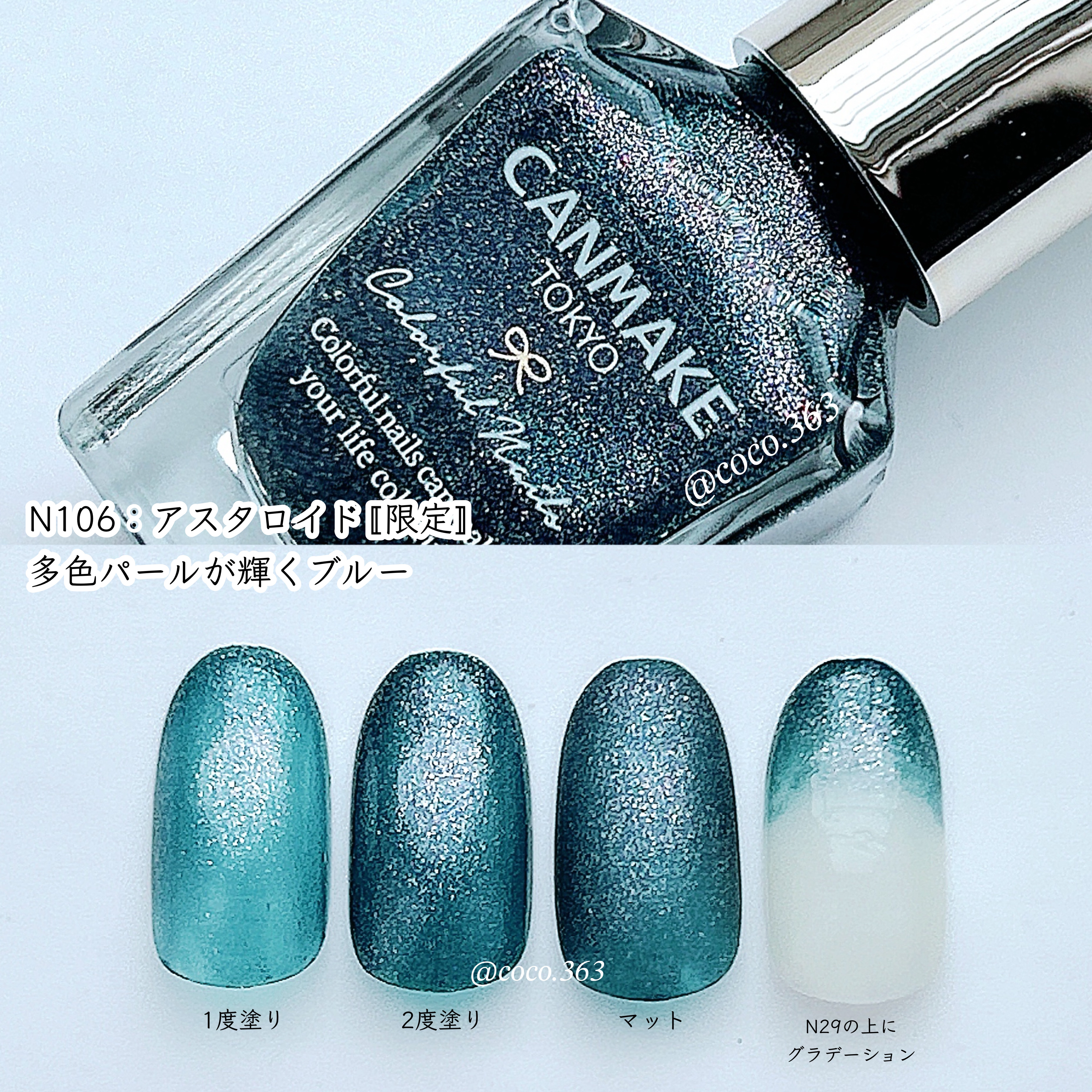 どれもめちゃくちゃ可愛いですが、私のおすすめはN104とN106😍! まさにこんな色が欲しかった❤️! ホロ入りラメカラーはどんなデザインにもアクセントとして使いやすいし、N106の薄すぎず濃すぎないブルーがめちゃくちゃ好き💙 今回の限定色はストックを買っておきたい💪🏻! 定番化してほしいな〜🥺