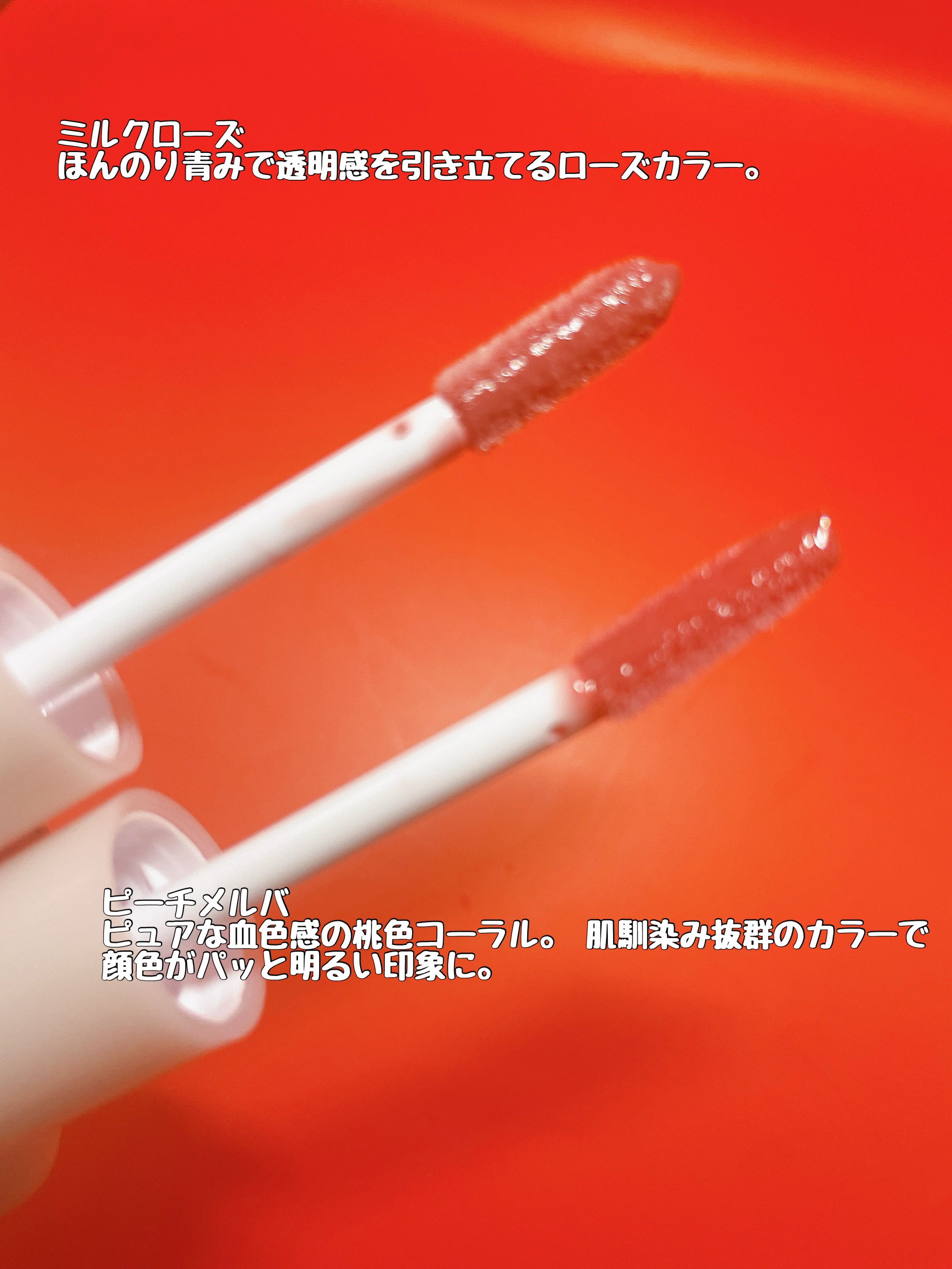 - <01 ピーチメルバ> ミネラルオイル、水添ポリイソブテン、マイクロクリスタリンワックス、リンゴ酸ジイソステアリル、ヒドロキシステアリン酸エチルヘキシル、パルミチン酸デキストリン、ジメチルシリル化シリカ、フェノキシエタノール、メチルパラベン、トコフェロール、シメチコン、水、BG、ユズ果実エキス、モウソウチクたけのこ皮エキス、チャ葉エキス、セイヨウハッカ葉エキス、酸化チタン、黄5、赤202、黄4、酸化鉄、ラウロイルリシン、赤104(1)、水酸化Al、シリカ <02 ミルクローズ> ミネラルオイル、水添ポリイソブテン、マイクロクリスタリンワックス、リンゴ酸ジイソステアリル、ヒドロキシステアリン酸エチルヘキシル、パルミチン酸デキストリン、ジメチルシリル化シリカ、フェノキシエタノール、メチルパラベン、トコフェロール、シメチコン、水、BG、ユズ果実エキス、モウソウチクたけのこ皮エキス、チャ葉エキス、セイヨウハッカ葉エキス、酸化チタン、黄5、赤202、青1、ラウロイルリシン、水酸化Al、酸化鉄、シリカ