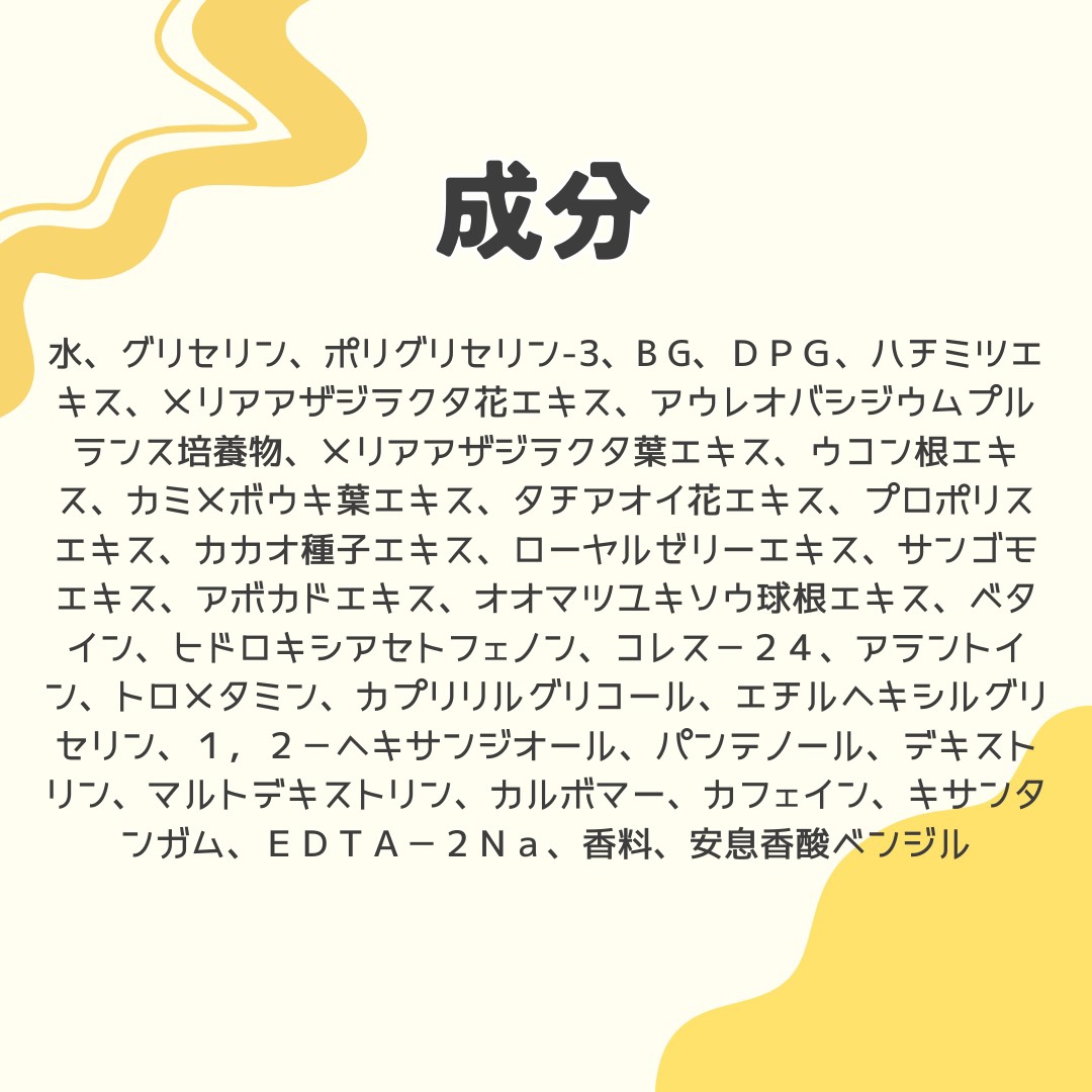 - <30mL×3枚> 水、BG、グリセリン、キサンタンガム、カルボマー、香料、ローヤルゼリーエキス、カプリリルグリコール、エチルヘキシルグリセリン、DPG、ベタイン、デキストリン、パンテノール、1,2-ヘキサンジオール、アラントイン、カフェイン、EDTA-2Na、アウレオバシジウムプルランス培養物、トロメタミン、アボカドエキス、マルトデキストリン、ヒドロキシアセトフェノン、ポリグリセリン-3、ハチミツエキス、プロポリスエキス、カミメボウキ葉エキス、メリアアザジラクタ葉エキス、メリアアザジラクタ花エキス、ウコン根エキス、サンゴモエキス、タチアオイ花エキス、コレス-24、カカオ種子エキス、オオマツユキソウ球根エキス <1枚> 水、BG、グリセリン、キサンタンガム、カルボマー、香料、ローヤルゼリーエキス、カプリリルグリコール、エチルヘキシルグリセリン、DPG、ベタイン、デキストリン、パンテノール、1,2-ヘキサンジオール、アラントイン、カフェイン、EDTA-2Na、アウレオバシジウムプルランス培養物、トロメタミン、アボカドエキス、マルトデキストリン、ヒドロキシアセトフェノン、ポリグリセリン-3、ハチミツエキス、プロポリスエキス、カミメボウキ葉エキス、メリアアザジラクタ葉エキス、メリアアザジラクタ花エキス、ウコン根エキス、サンゴモエキス、タチアオイ花エキス、コレス-24、カカオ種子エキス、オオマツユキソウ球根エキス