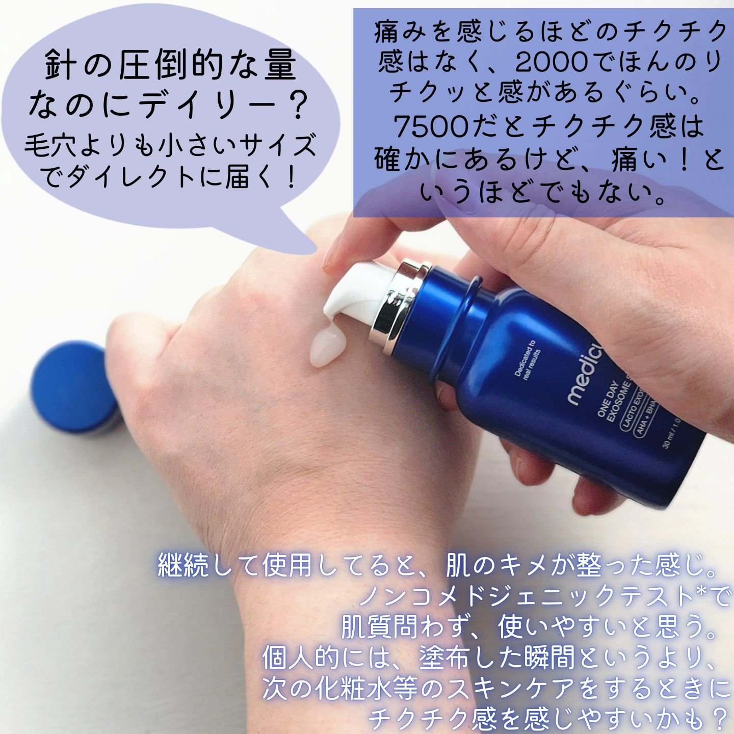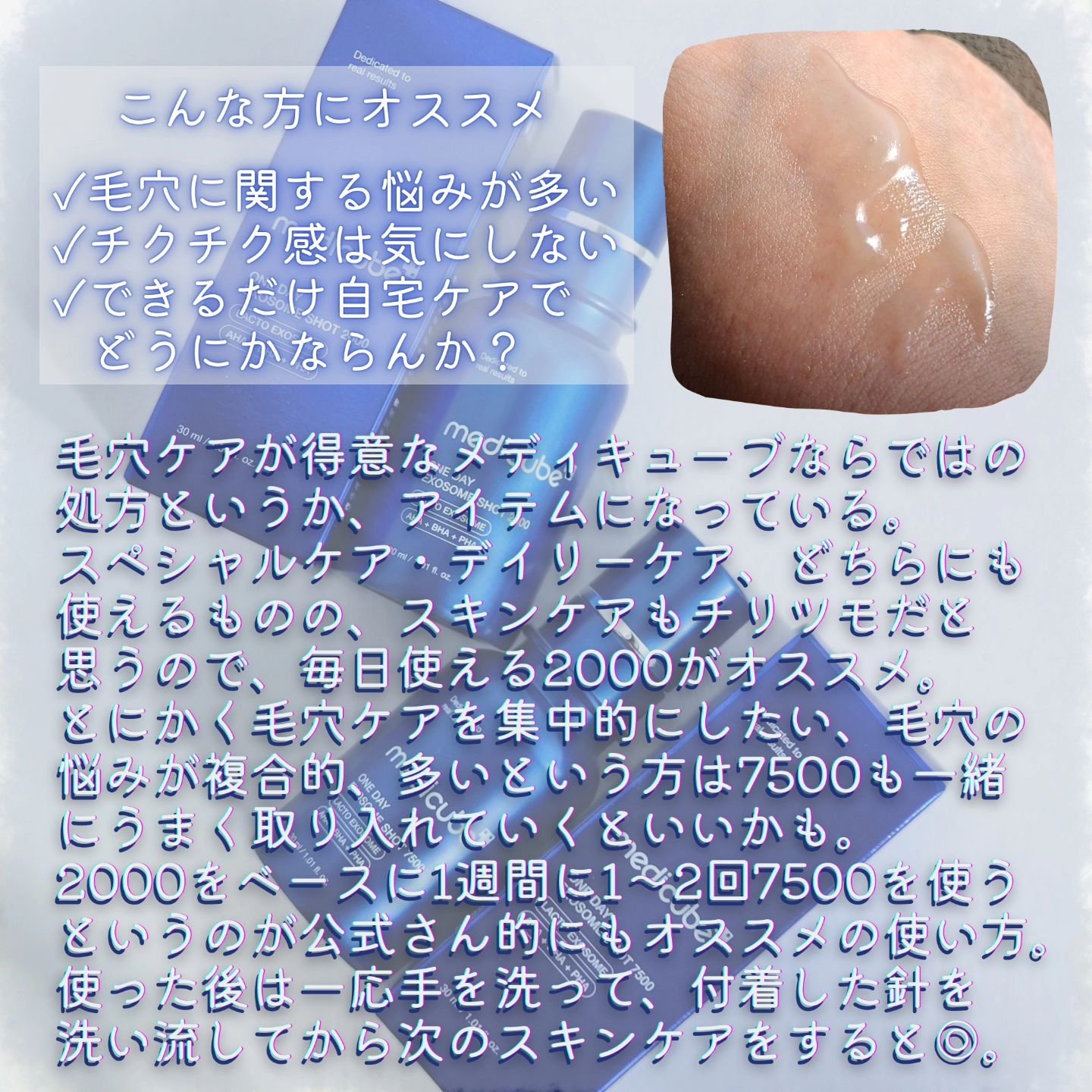 2000と7500、どちらもジェルのようなみずみずしいテクスチャー。 数字の大きさに恐る恐る使ってみたのですが、意外とチクチク感は強くないと思いました。 毛穴よりも13倍小さい16μmというサイズで、エステ専門ケア並みの効果が得られるそう。 水分クリームと一緒に使っているのですが、肌がもちっとして相性がいいみたいです。