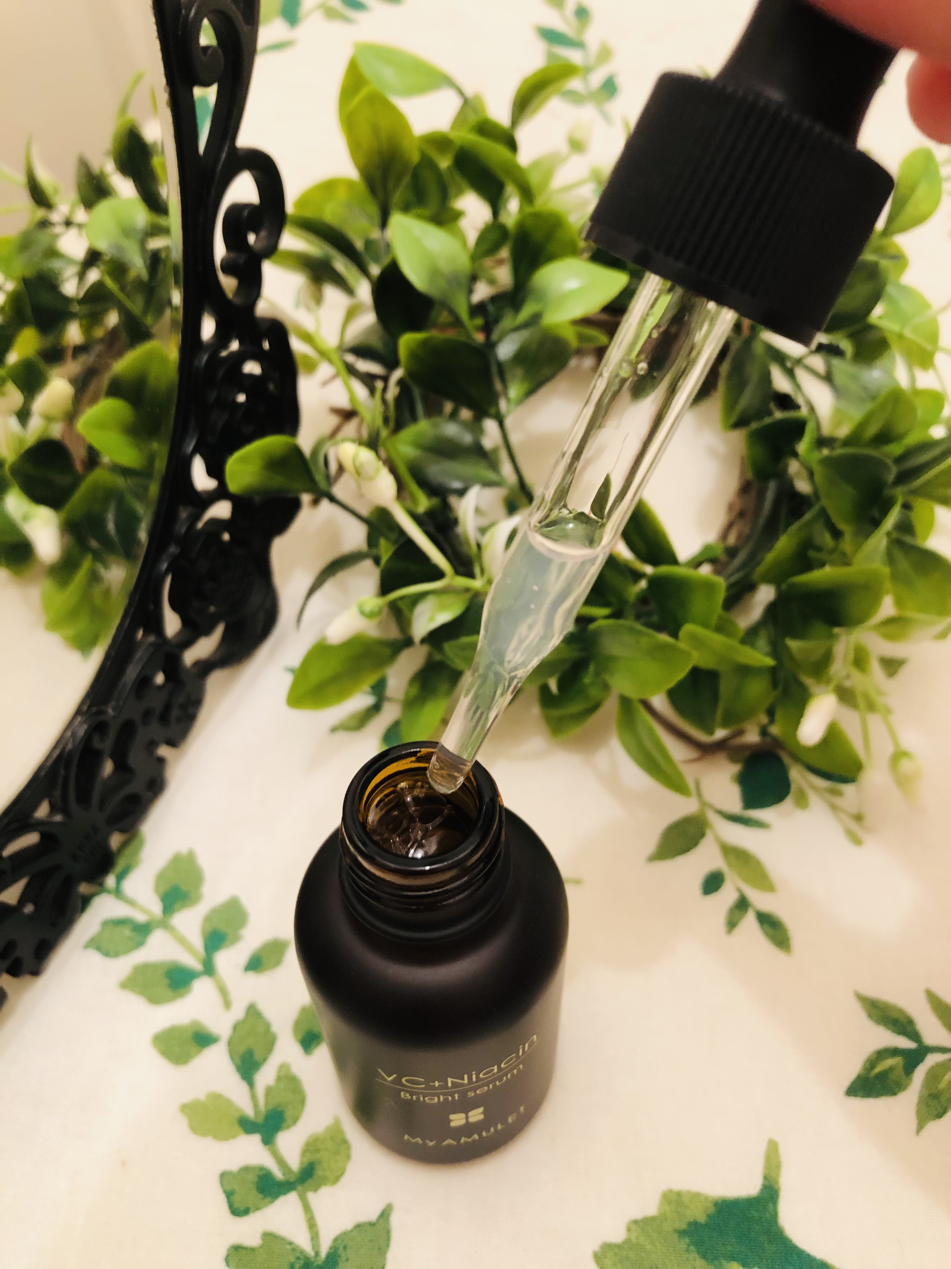 高機能ビタミンC誘導体のポアショット®を配合した、マイアミュレットの導入美容液。 なめらかな肌へサポートしてくれるんだって♡ テクスチャーはさらっとしていて、スーッとなじみの良い使い心地。