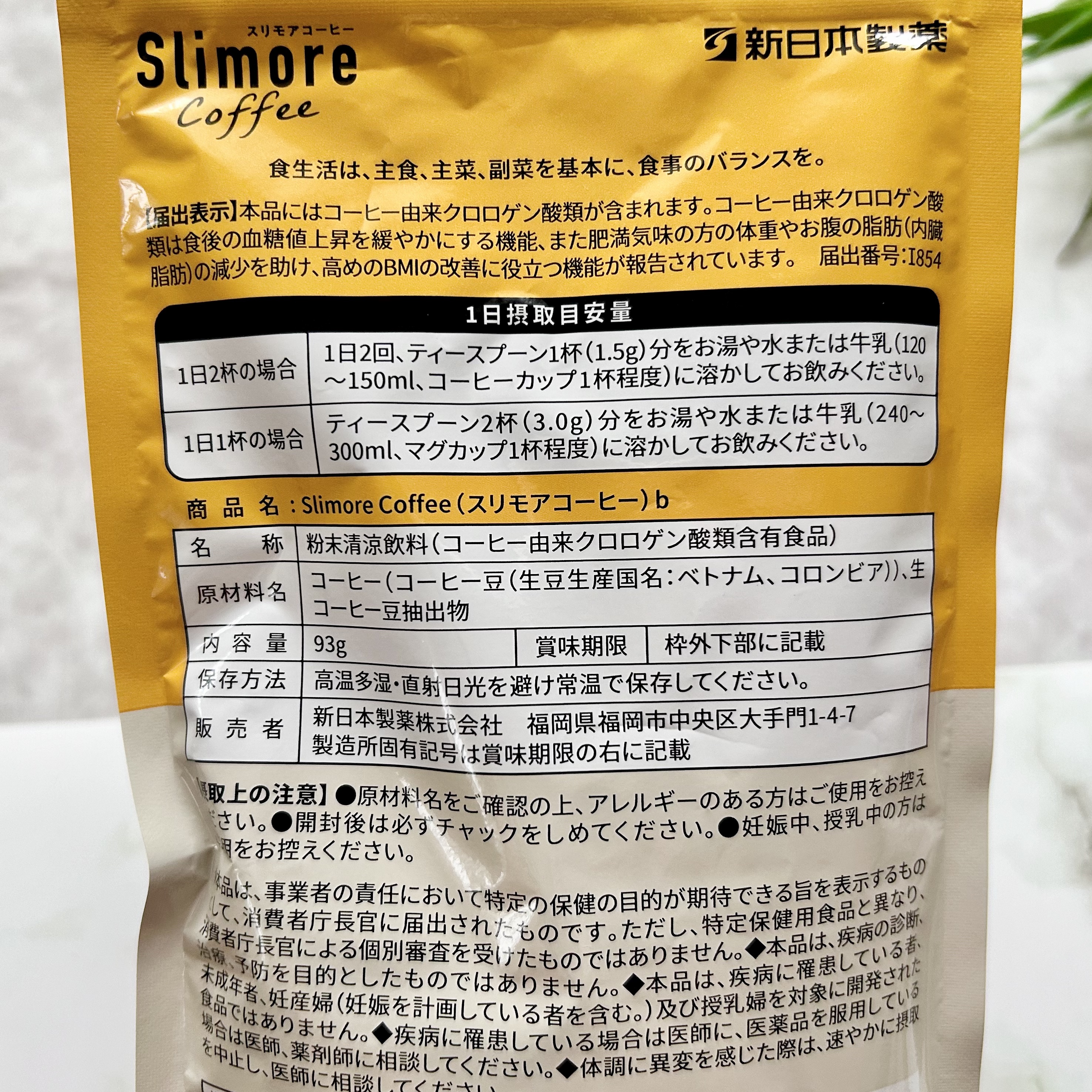 Slimore Coffeeは、肥満気味の方の体重・内臓脂肪減少サポートの確かな機能を有するコーヒー由来クロロゲン酸類を配合した機能性表示食品です。 いつものコーヒーをスリモアコーヒーに変えるだけなので、取り入れやすいです。 味や風味などはインスタントコーヒーと変わらなくてとっても美味しいです。